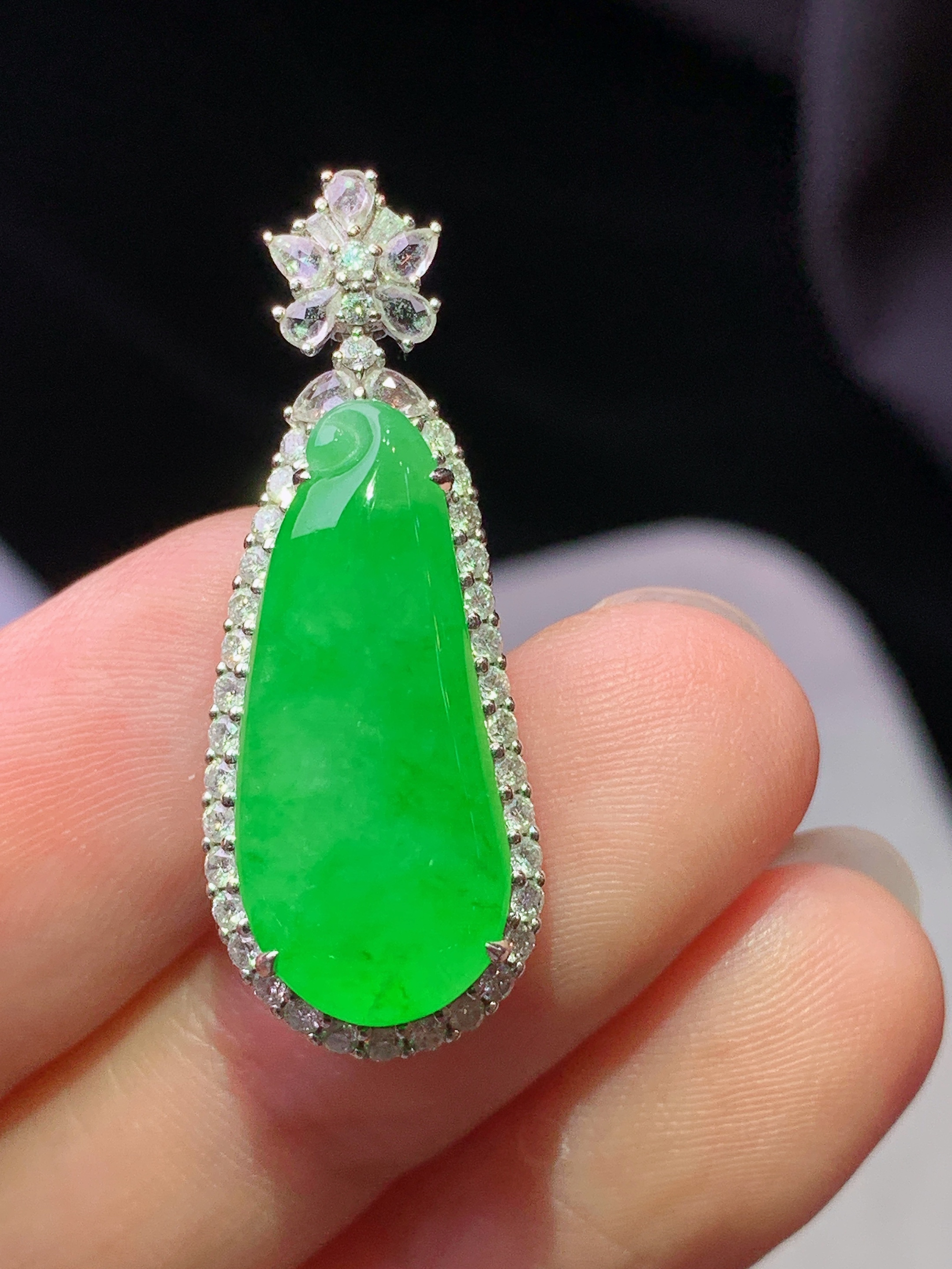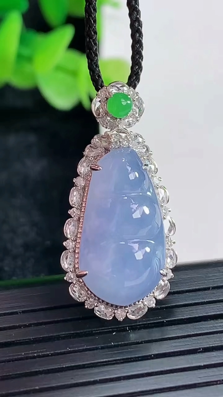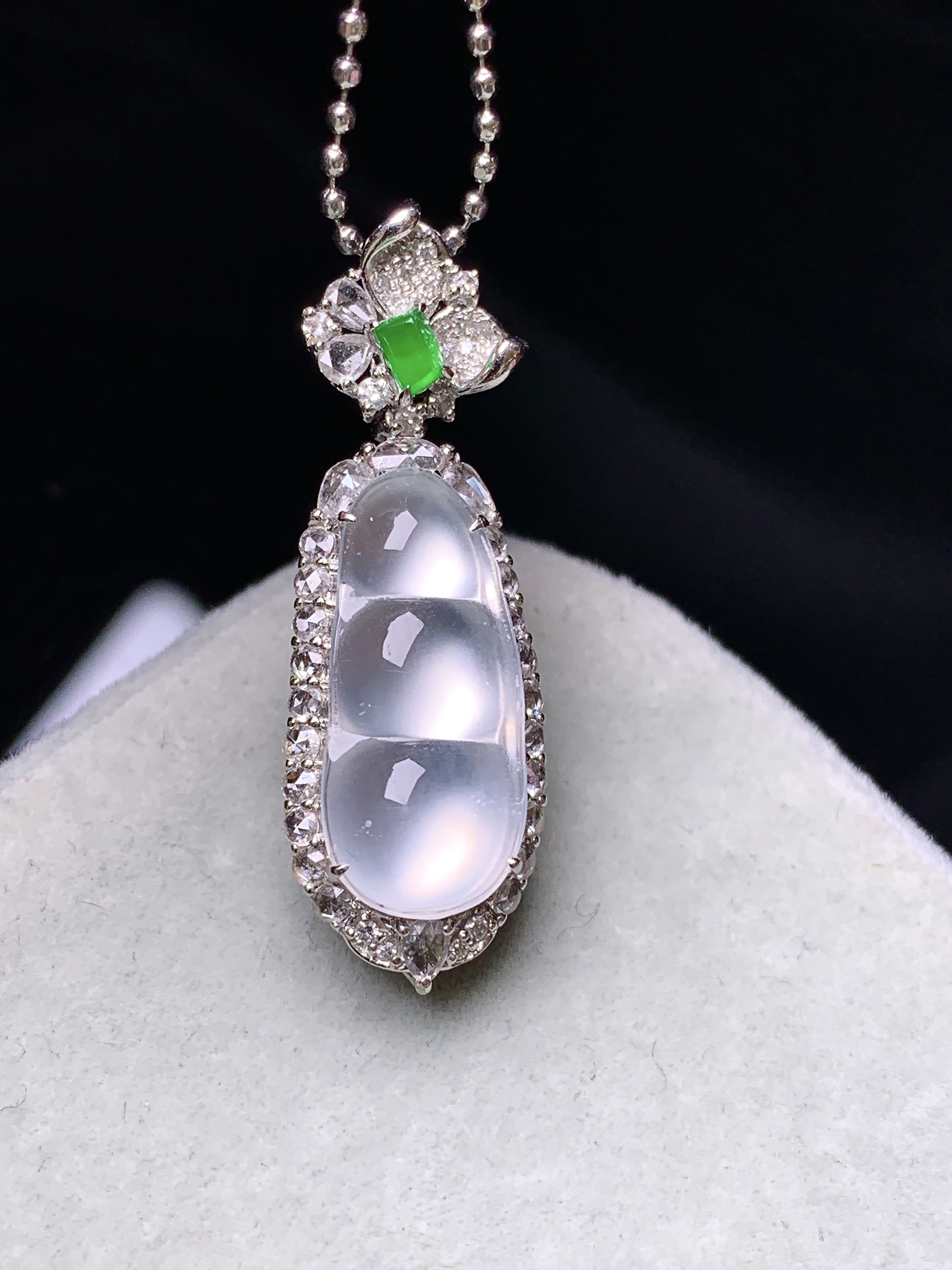冰种蛋面吊坠,玉质细腻,荧光感超 强,饱满圆润,尽显优雅气质,18k 金豪华镶嵌