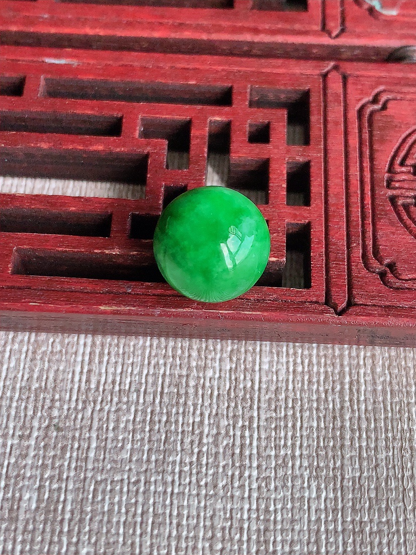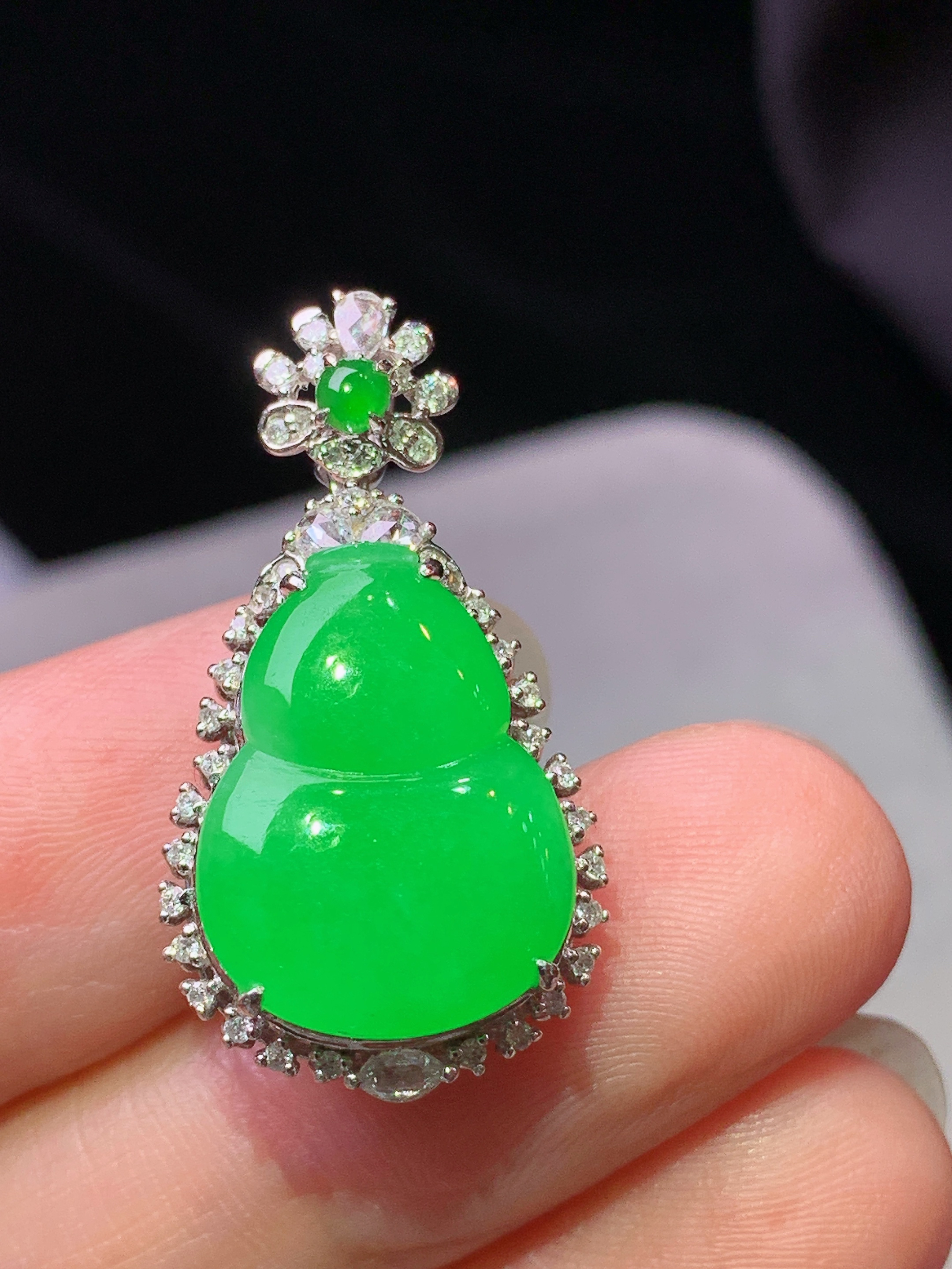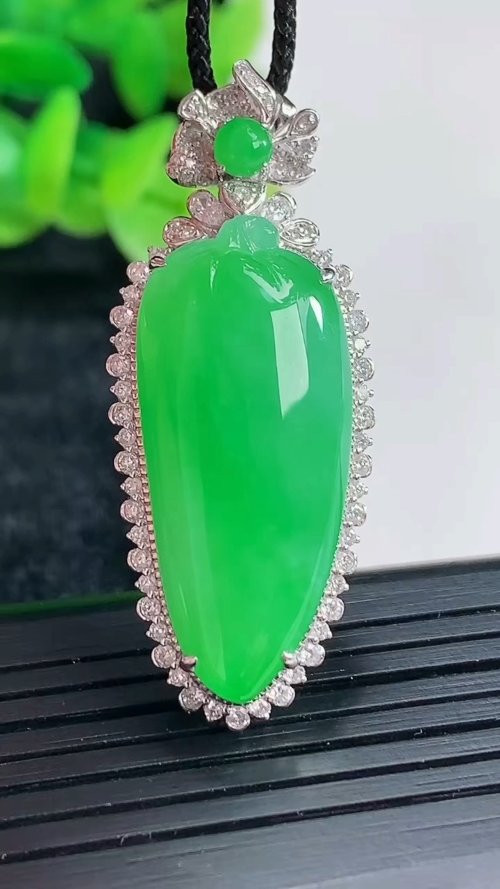 冰种蛋面吊坠,玉质细腻,荧光感超 强,饱满圆润,尽显优雅气质,18k 金豪华镶嵌