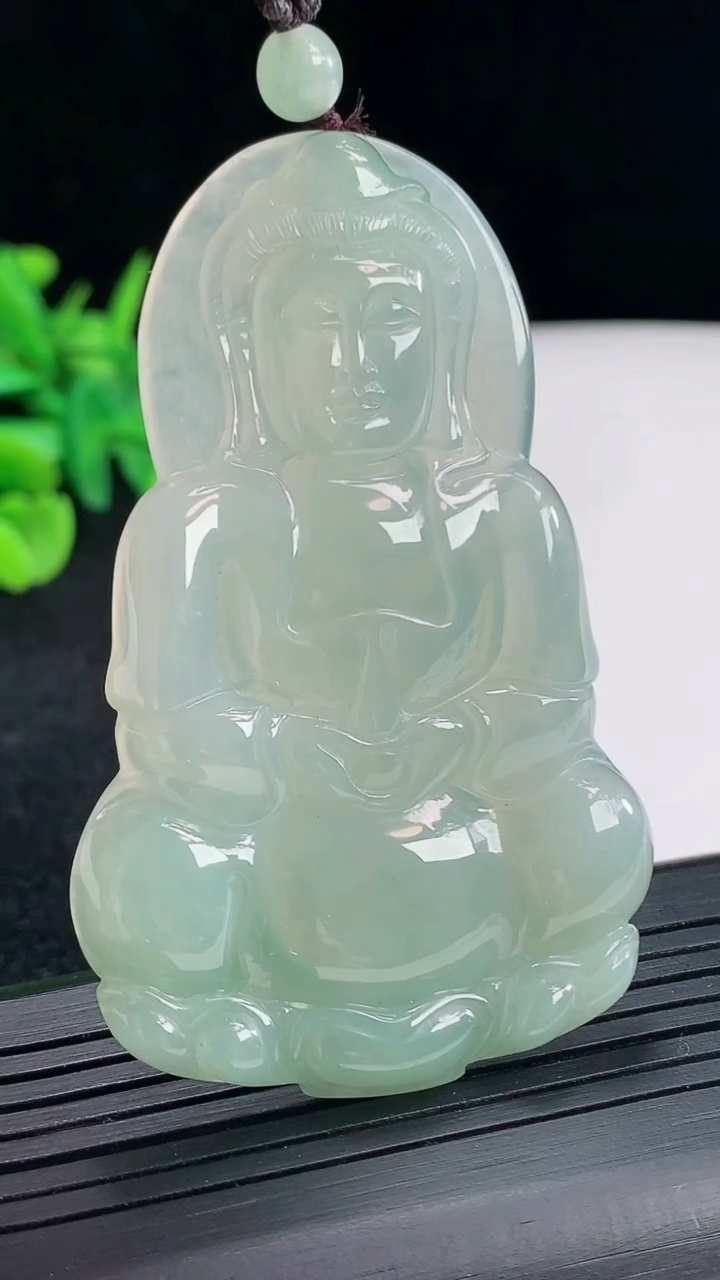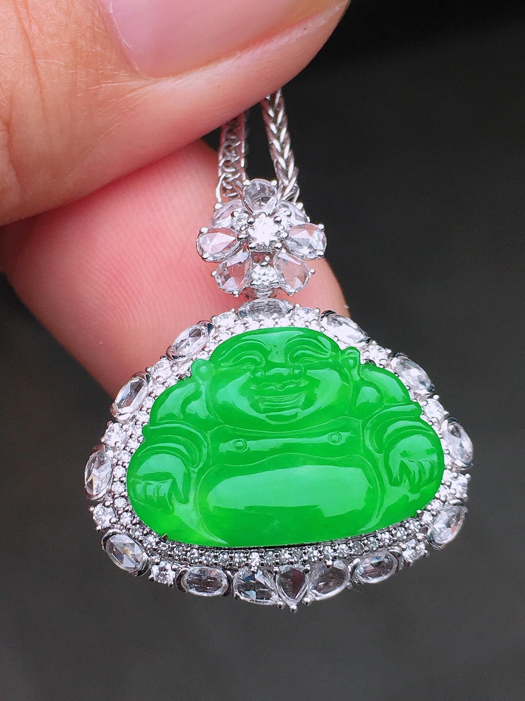 阳绿佛公吊坠,色泽均匀艳丽,玉质细腻,荧光感超 强,饱满圆润,尽显优雅气质,18k 金豪华镶嵌