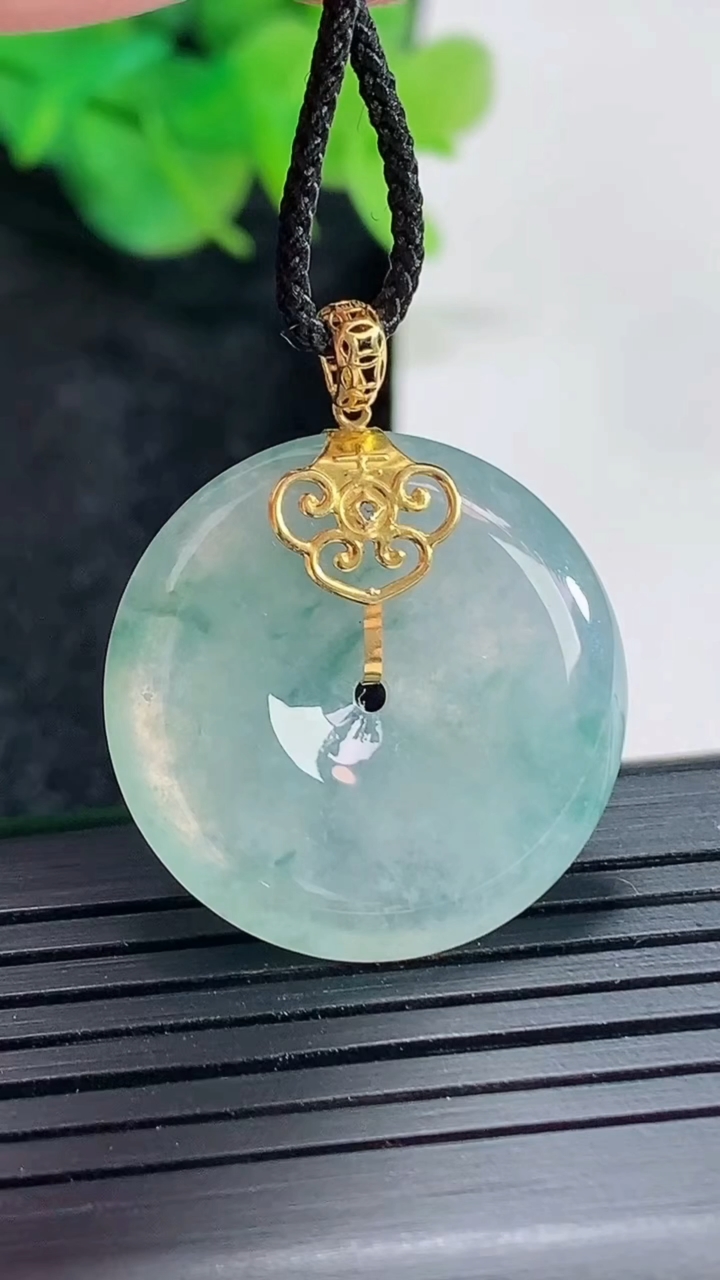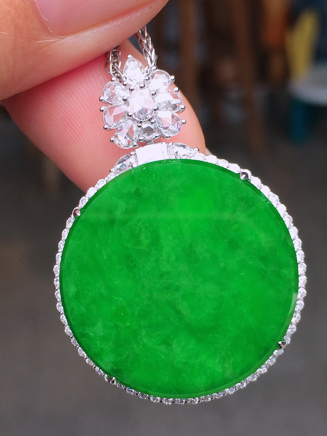阳绿平安扣吊坠,色泽均匀艳丽,玉质细腻,荧光感超 强,饱满圆润,尽显优雅气质,18k 金豪华镶嵌