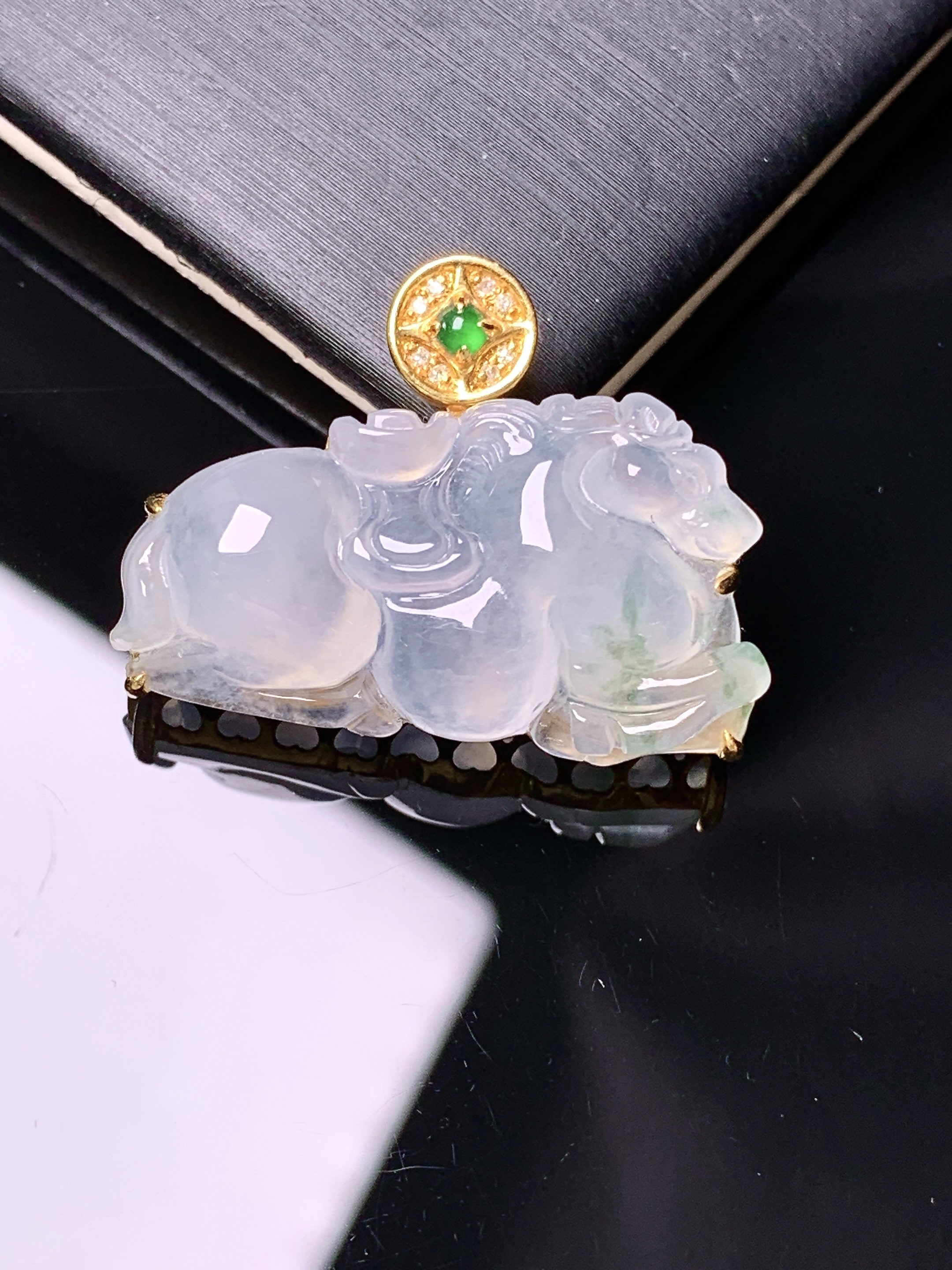 18k金钻镶嵌冰种唐马吊坠 玉质细腻 色泽艳丽清新 水润亮眼 整体尺寸22*28*8.3y4