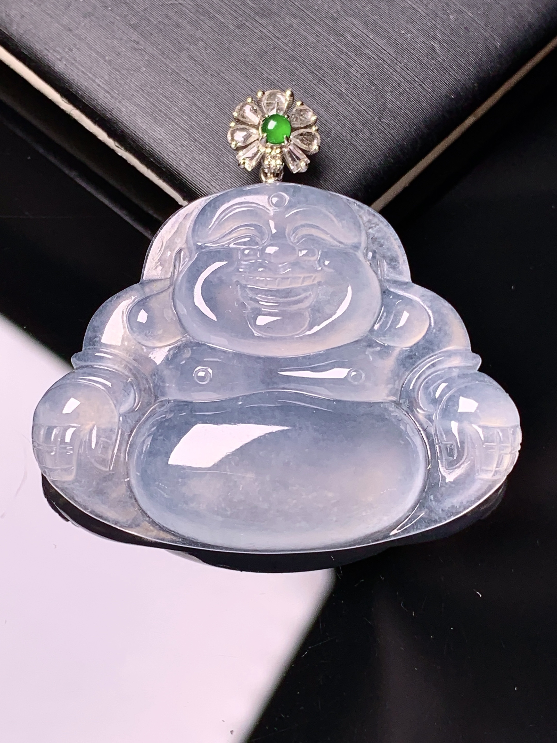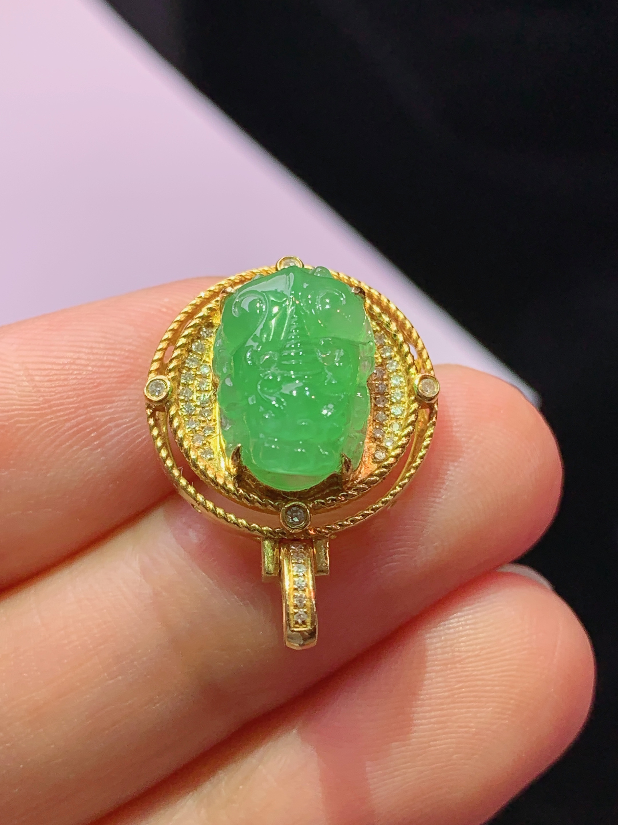 18k金钻镶嵌冰种佛公吊坠 玉质细腻 色泽艳丽清新 水润亮眼 整体尺寸35.7*36*5.5y4