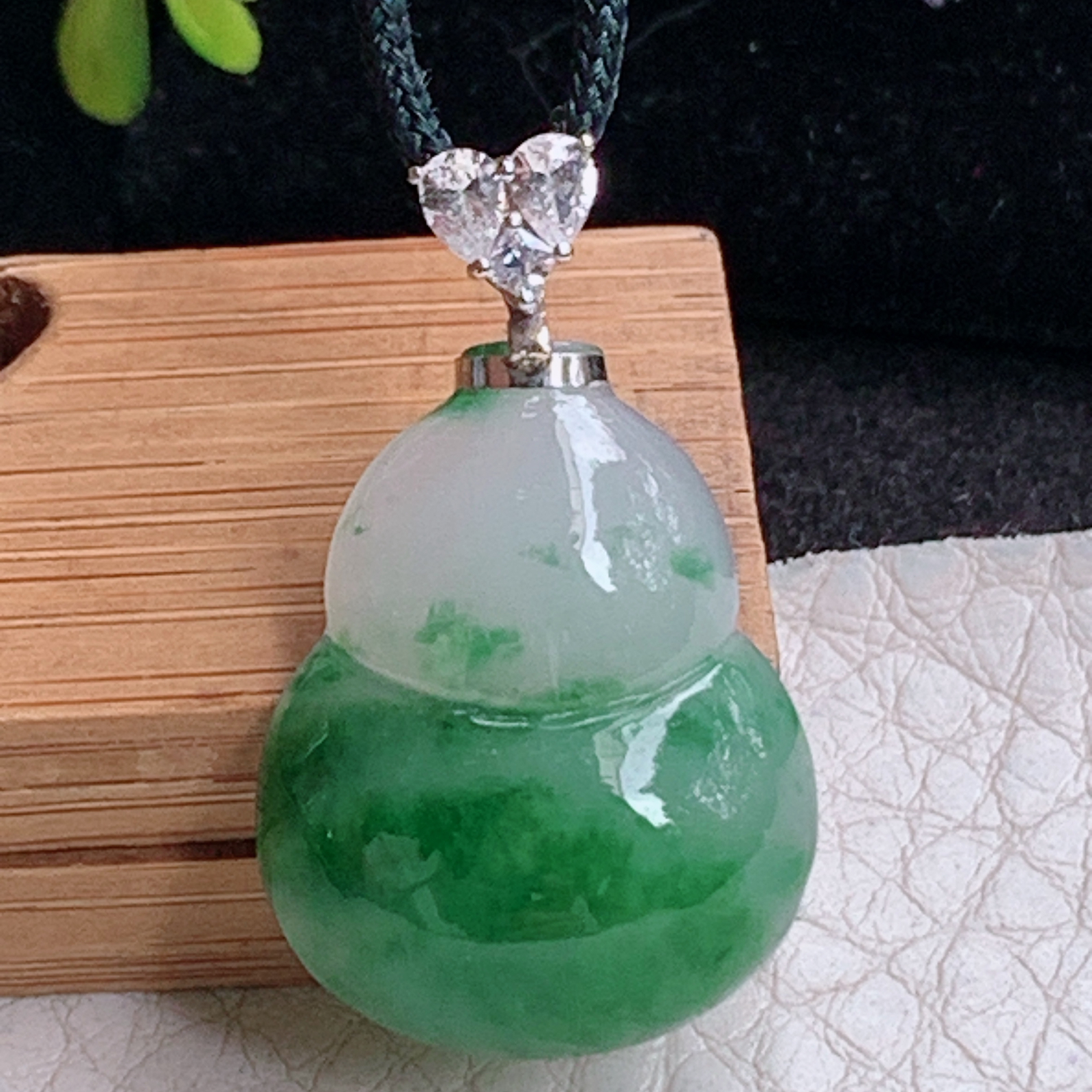 zz3实拍连金27.8*17*5天然缅甸翡翠飘绿花葫芦吊坠镶金扣精美福禄锁骨坠