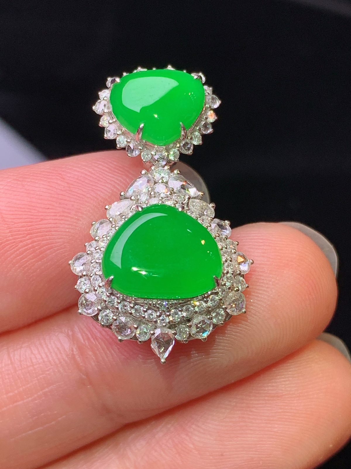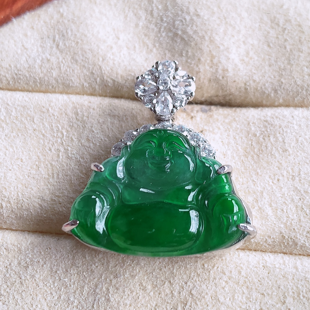 18k金钻镶嵌冰飘绿佛公吊坠 玉质细腻 色泽艳丽清新 水润亮眼 整体尺寸36*29*8.5a2