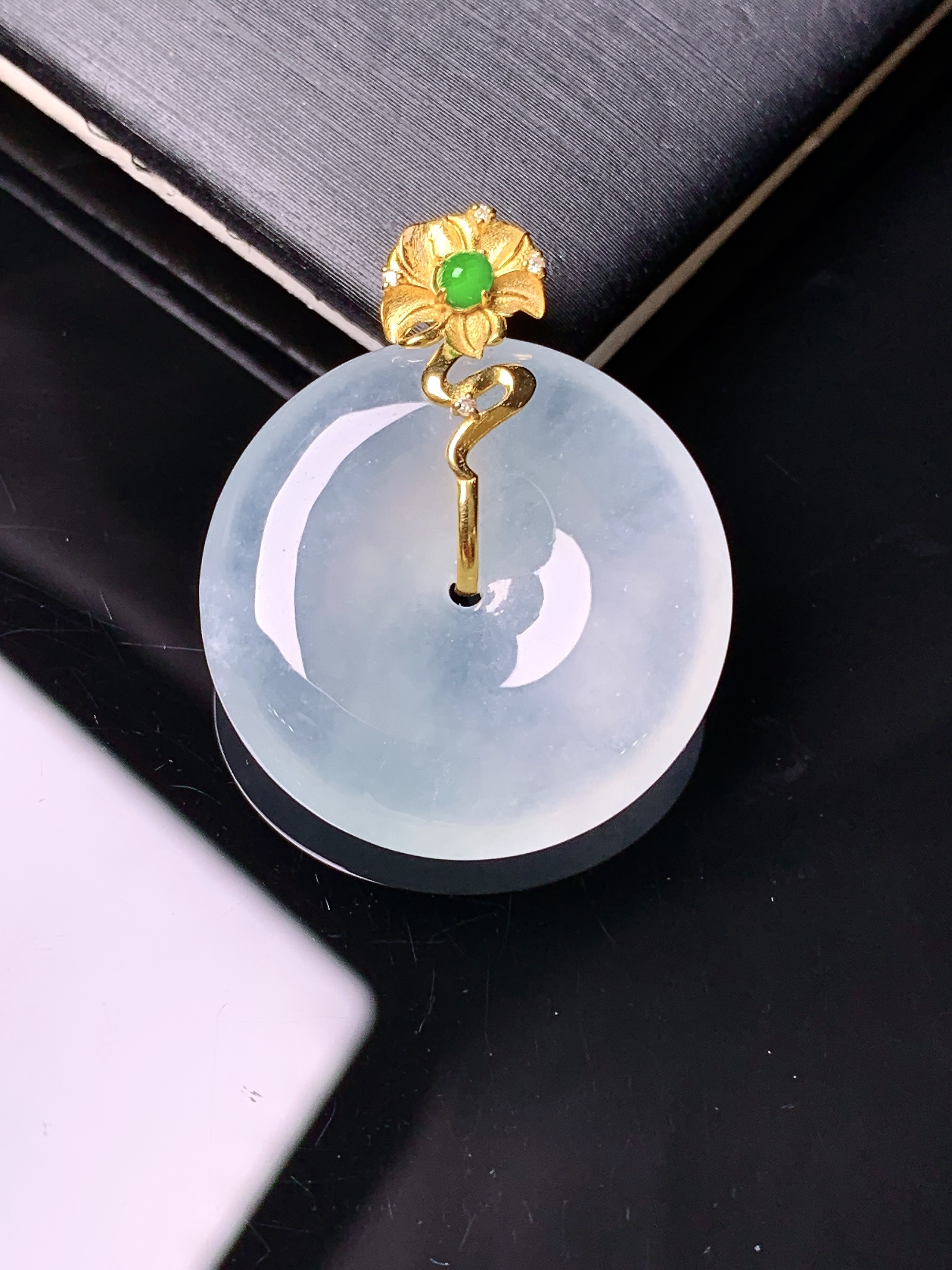 冰飘绿平安扣吊坠,色泽艳丽,玉质细腻,荧光感超 强,饱满圆润,尽显优雅气质,18k 金豪华镶嵌