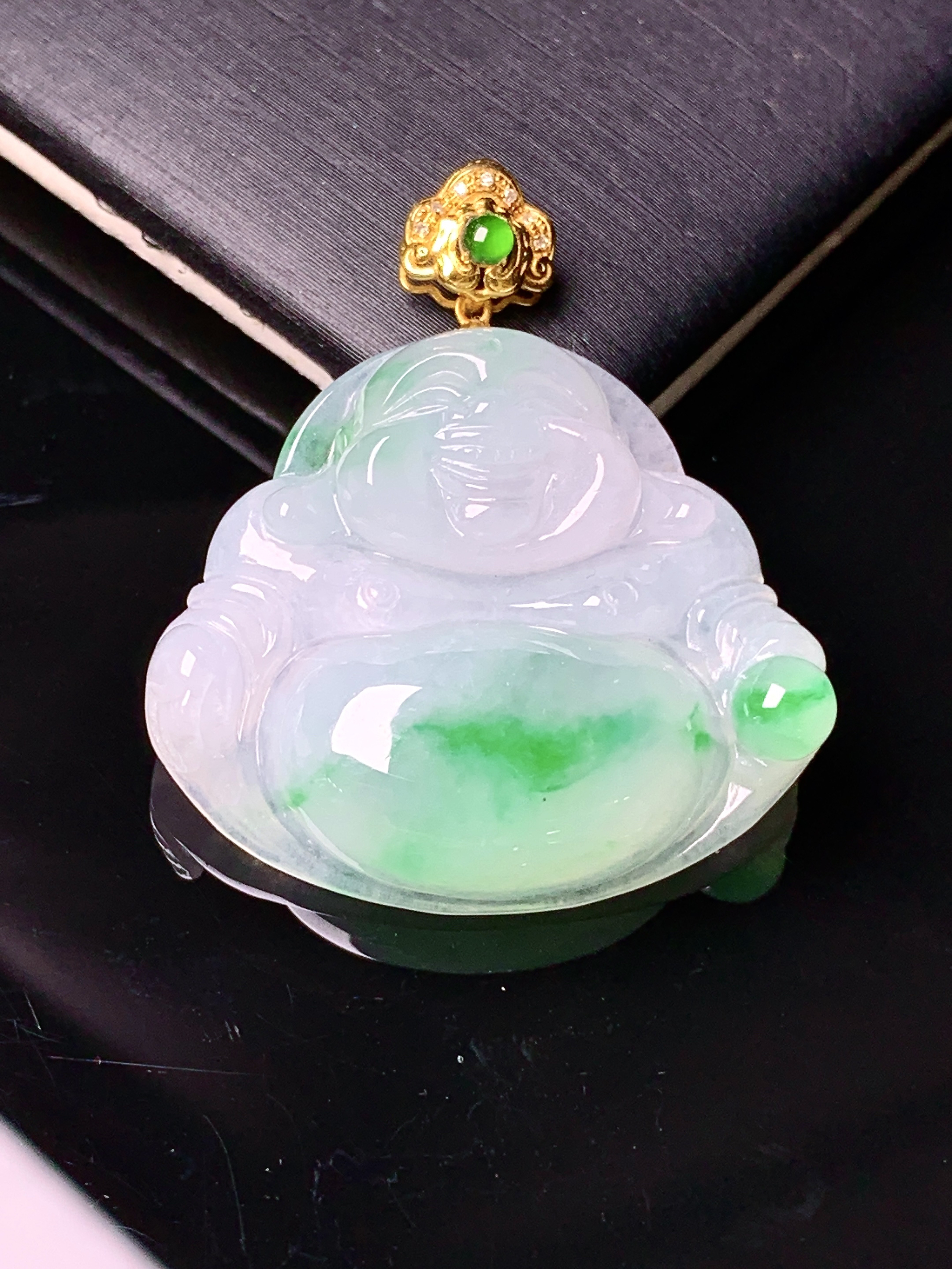 阳绿福瓜吊坠,色泽均匀艳丽,玉质细腻,荧光感超 强,饱满圆润,尽显优雅气质,18k 金豪华镶嵌
