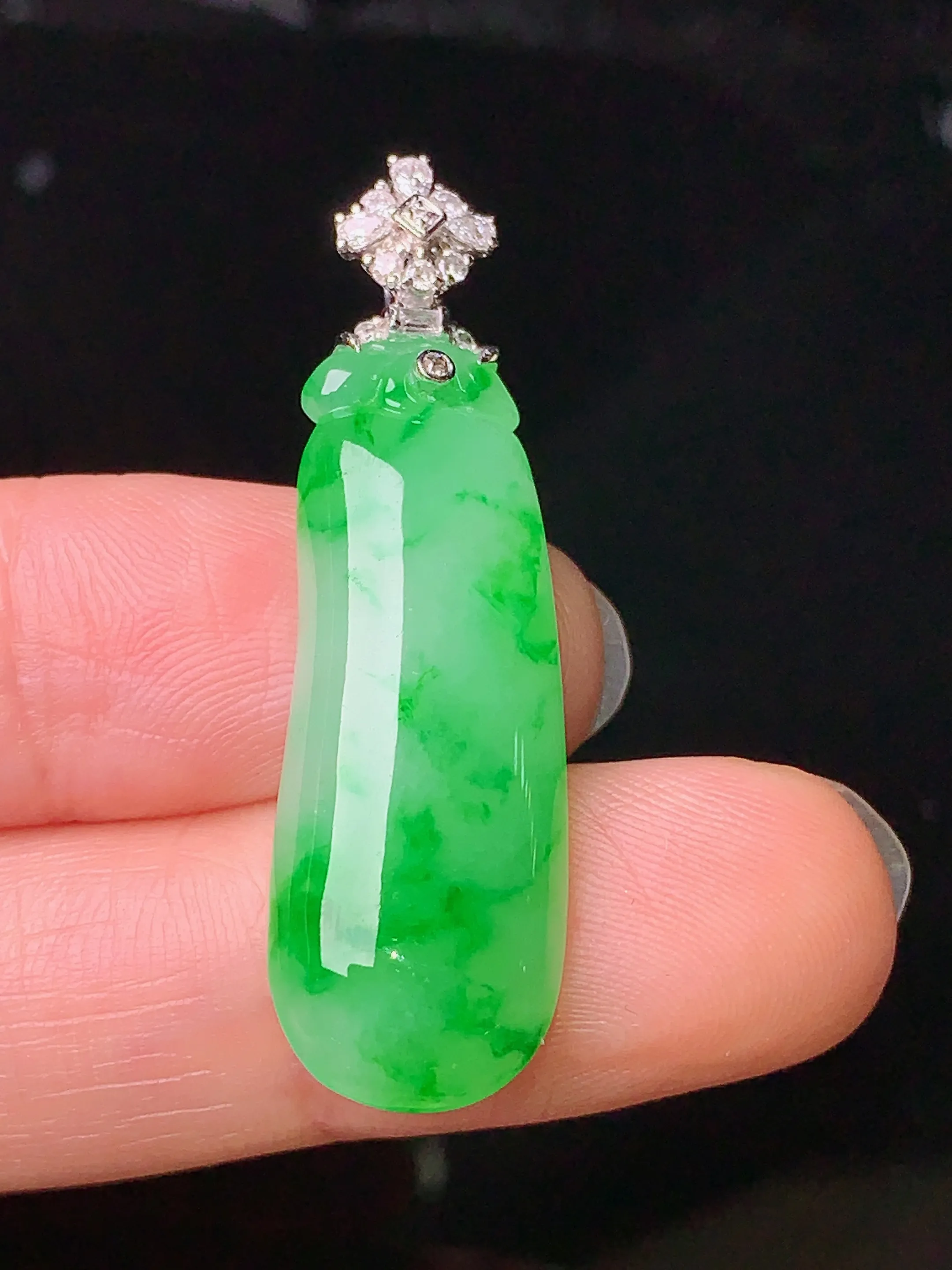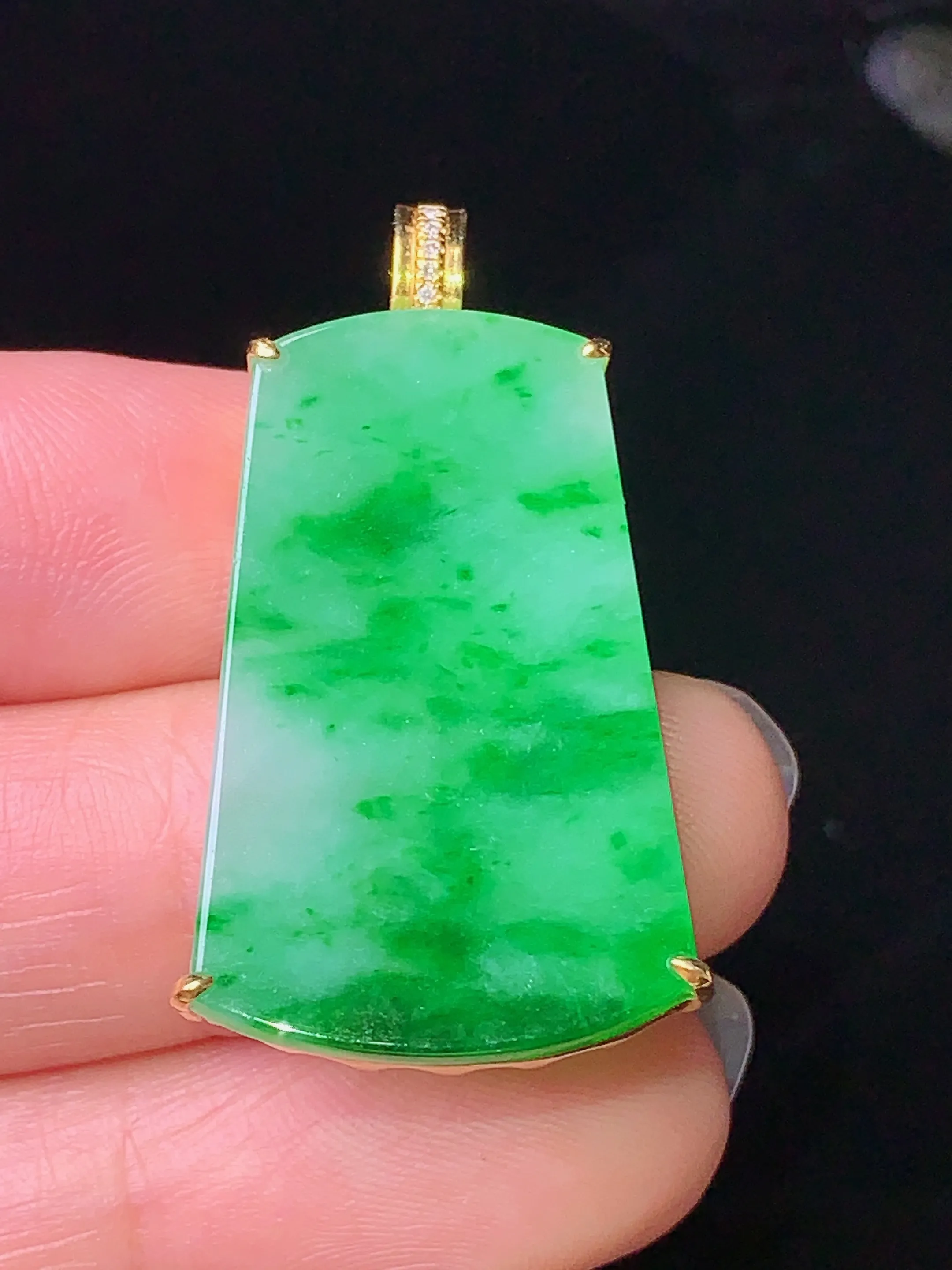 18k金钻镶嵌翠绿无事牌吊坠 玉质细腻 色泽艳丽 整体尺寸35.3*18*5