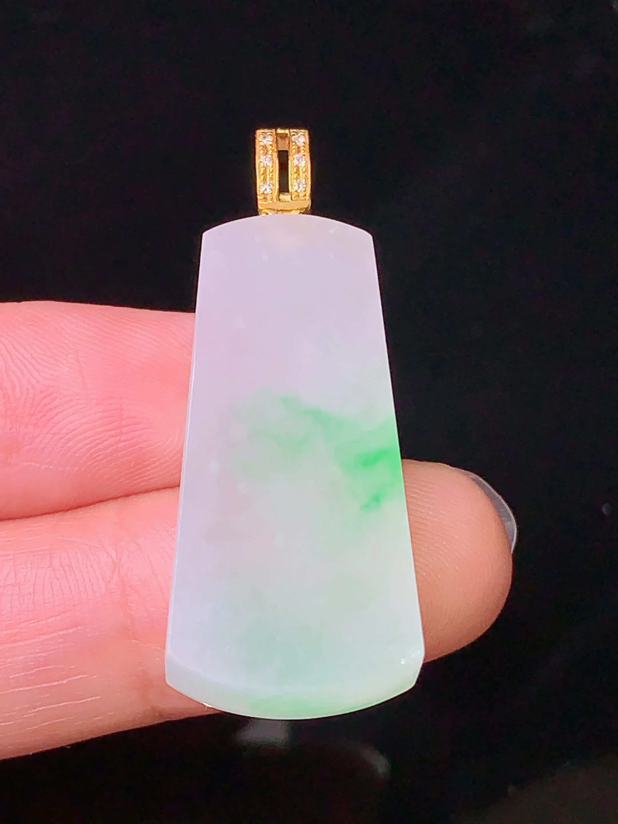 18k金钻镶嵌飘绿无事牌吊坠 玉质细腻 色泽艳丽 整体尺寸38.8*14.7*6