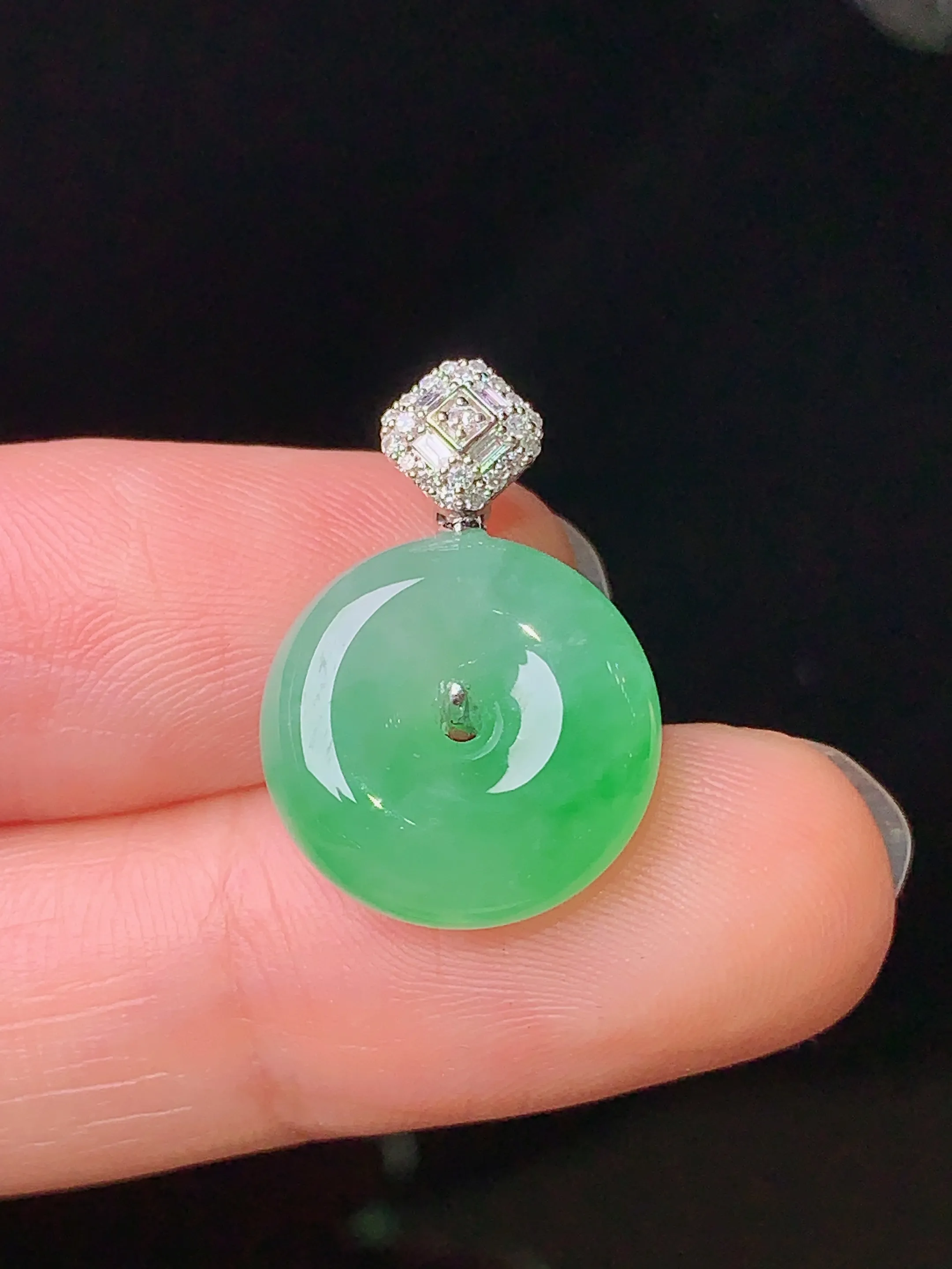 18k金钻镶嵌翠绿平安扣吊坠 玉质细腻 色泽艳丽 整体尺寸21*6