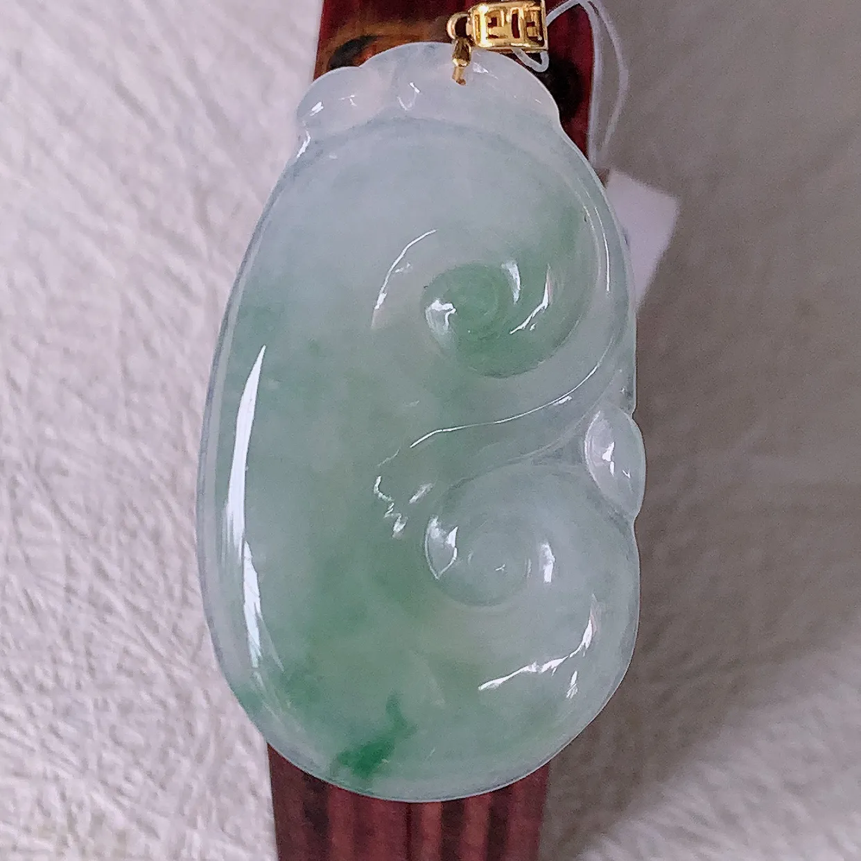 18K金镶嵌冰种飘花翡翠如意吊坠,简单的镶嵌设计、让玉坠百搭又精致,寓意着吉祥,事事如意!#49.1