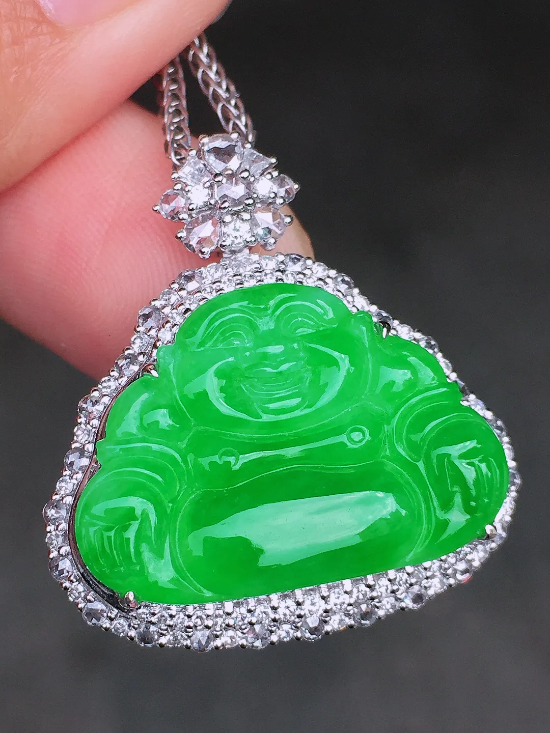 阳绿佛公吊坠,色泽均匀艳丽,玉质细腻,荧光感超 强,饱满圆润,尽显优雅气质,18k 金豪华镶嵌
