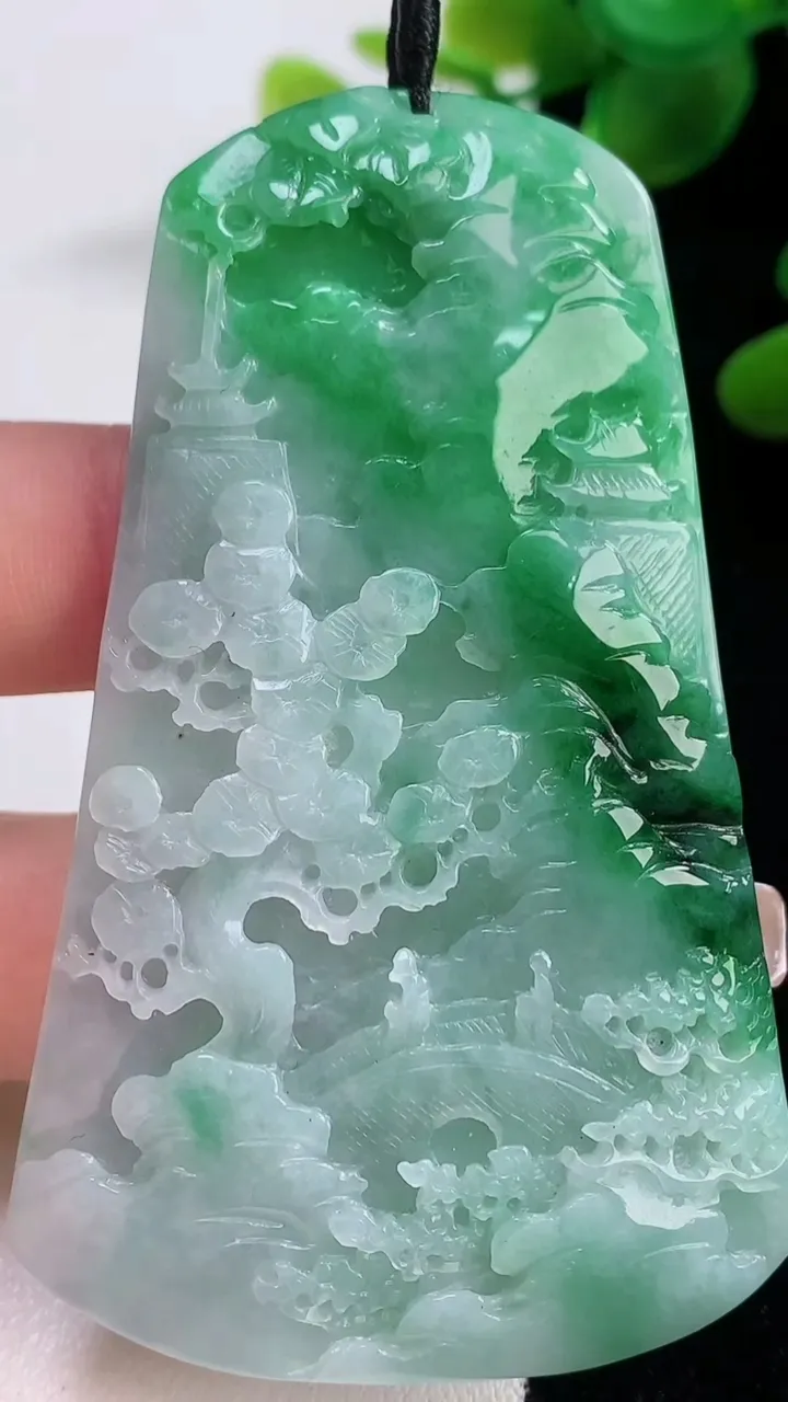 天然A货翡翠山水牌吊坠,尺寸70.4-43.2-5.9,重量:36.80g 12月18日