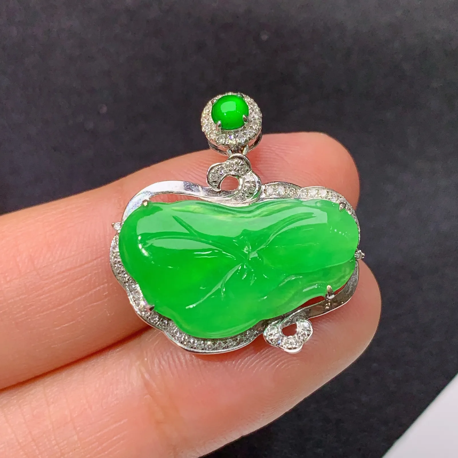 冰阳绿荷叶吊坠,18k金镶嵌,冰润色阳,玉质细腻,种水足,Xg 尺寸24.1*23.2*6.2
