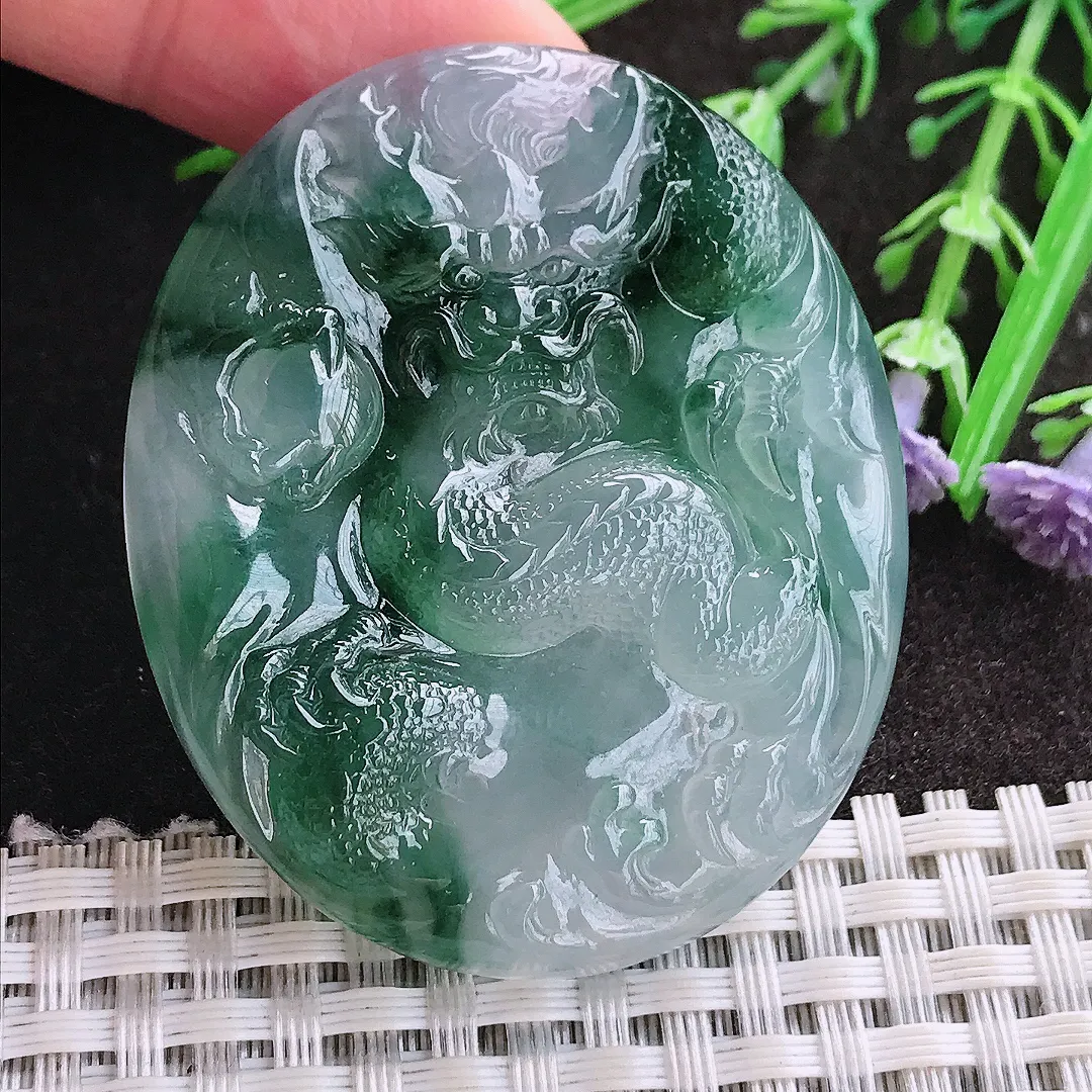实拍A货翡翠50.9/43/6.6老坑冰胶果冻冰飘花霸气龙牌吊坠翡翠玉牌挂件