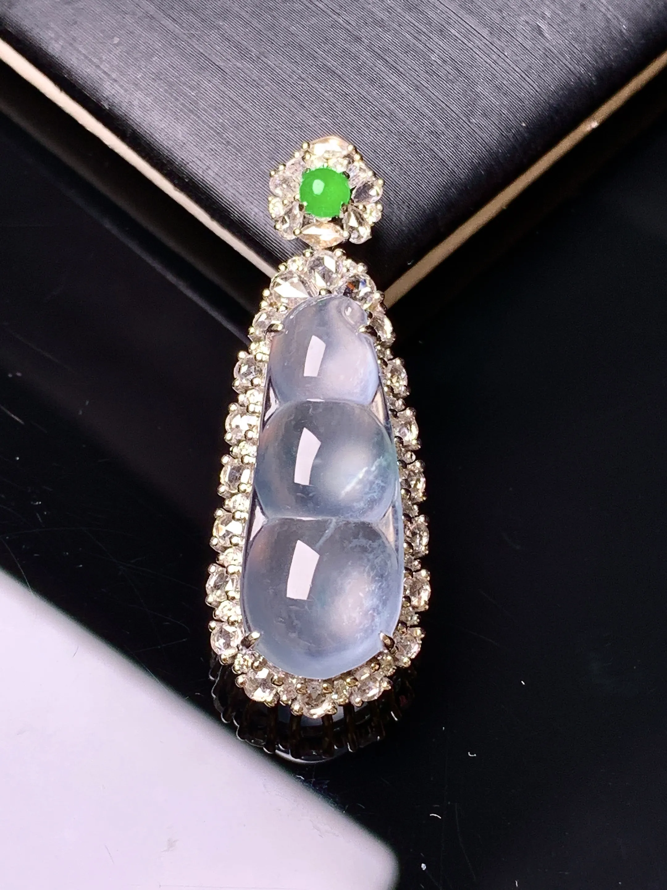 18k金钻镶嵌冰种四季豆吊坠 玉质细腻 色泽艳丽清新 整体尺寸33.8*12.6*9.2