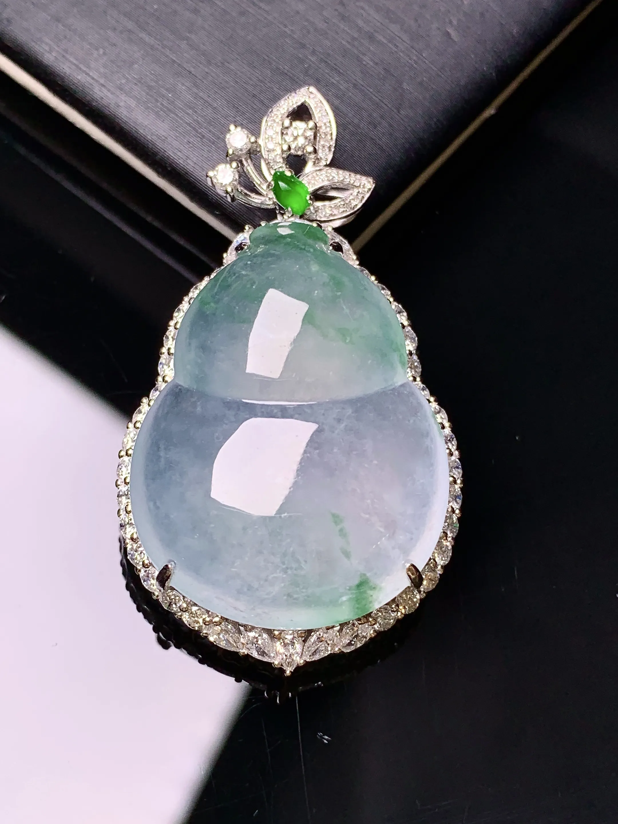 18k金钻镶嵌冰种飘绿葫芦吊坠 玉质细腻 色泽艳丽清新 整体尺寸41.2*23.2*10.8