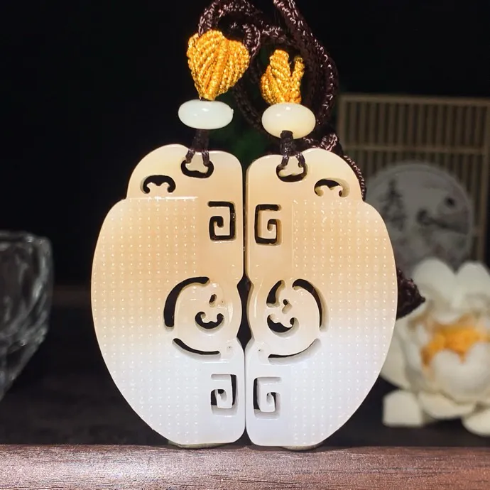 一对价!新疆和田玉白玉且末糖仿古龙凤对挂件 尺寸48/24/9重49克。玉质细腻油润。手推出油。佩戴