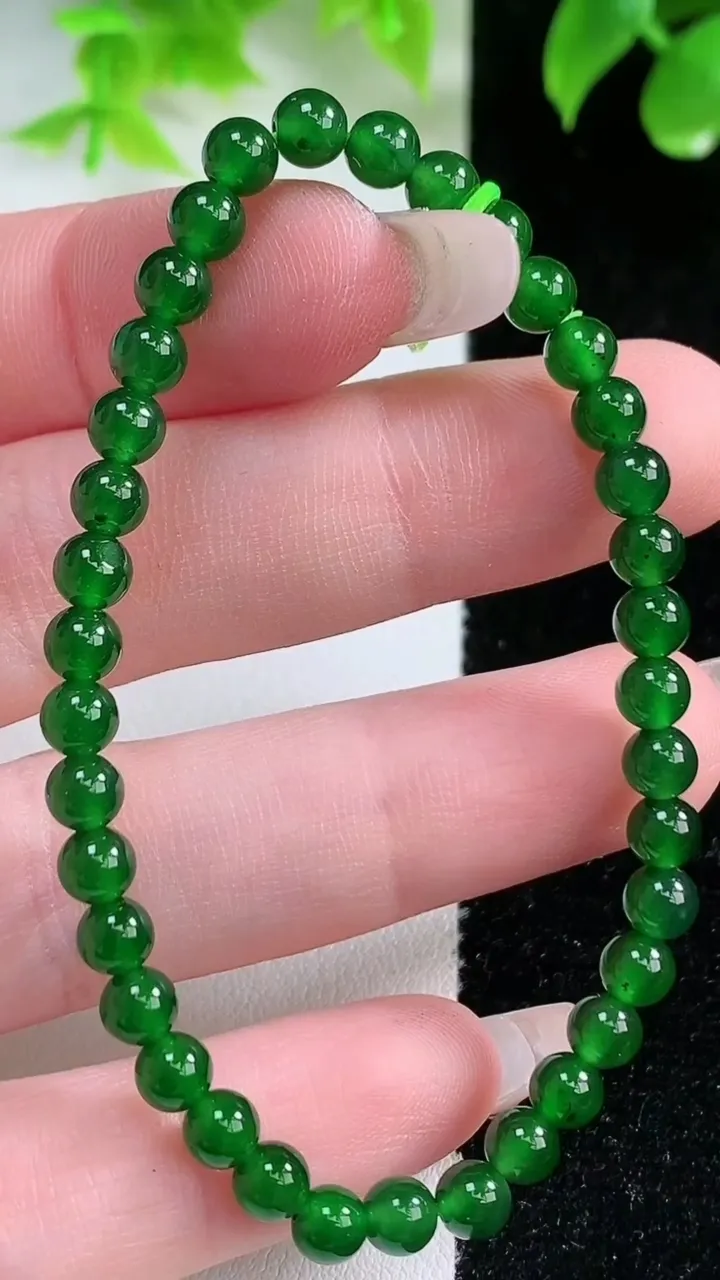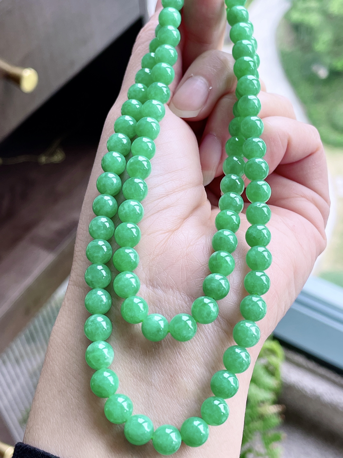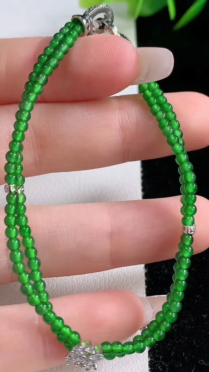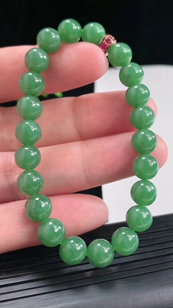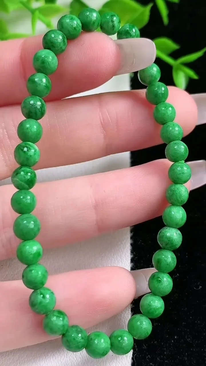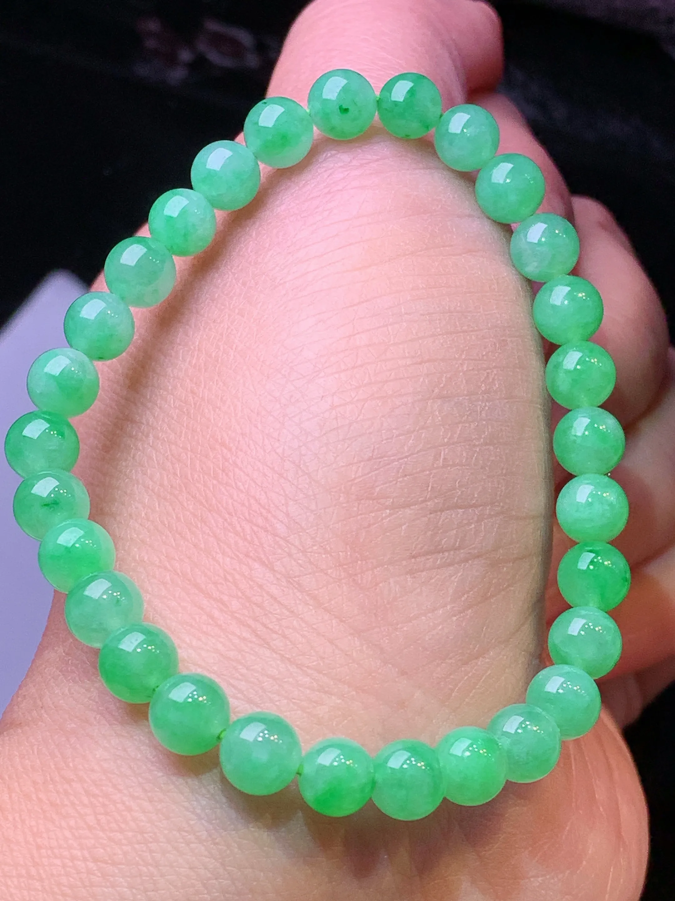 A货翡翠,冰润满绿圆珠手链,玉质细腻,色彩鲜艳,水头饱满,形体漂亮,水润精细,佩戴效果好