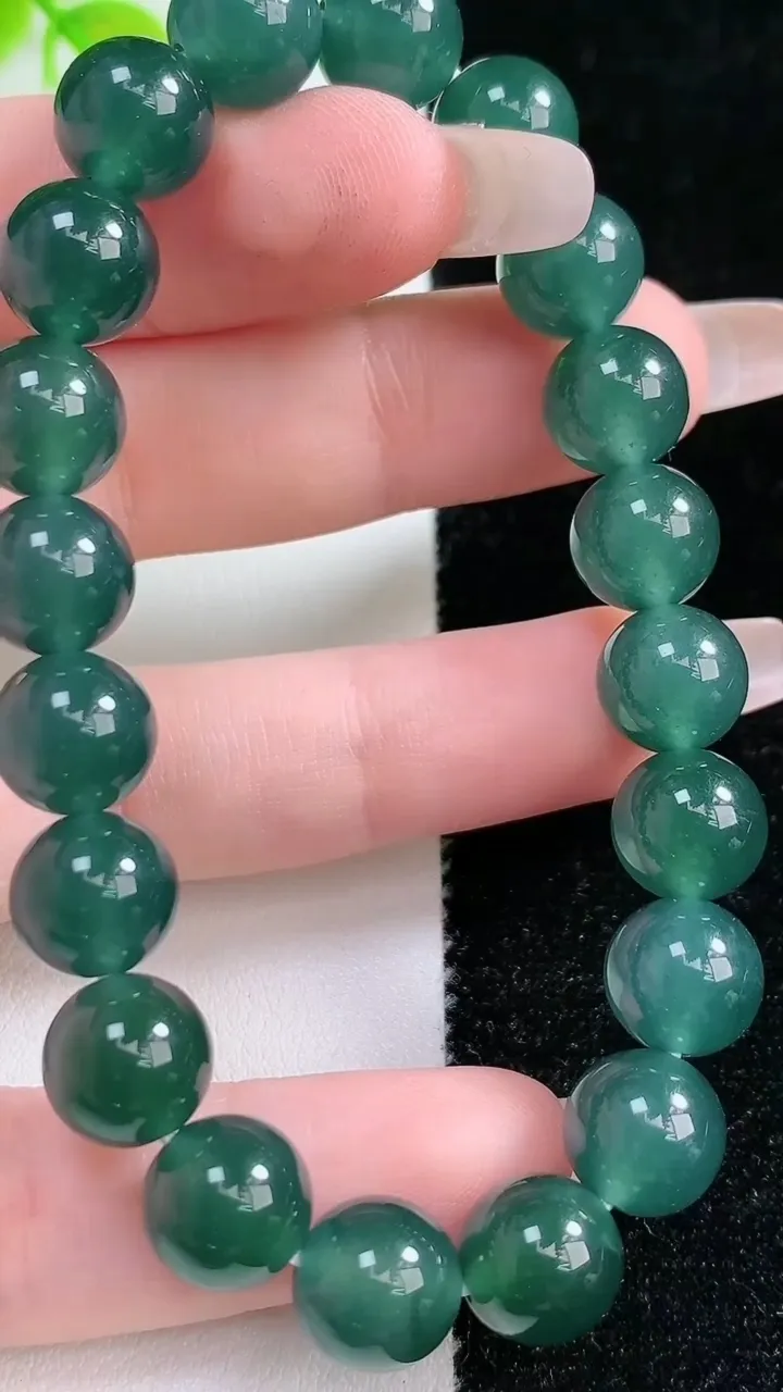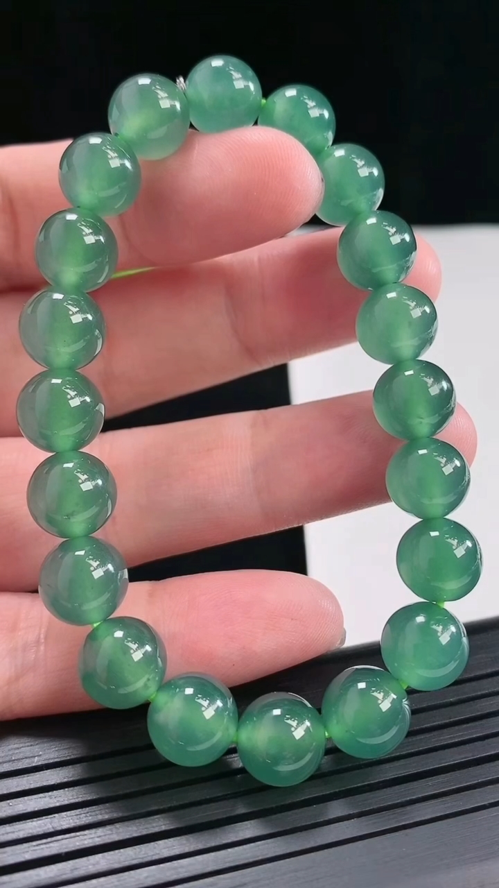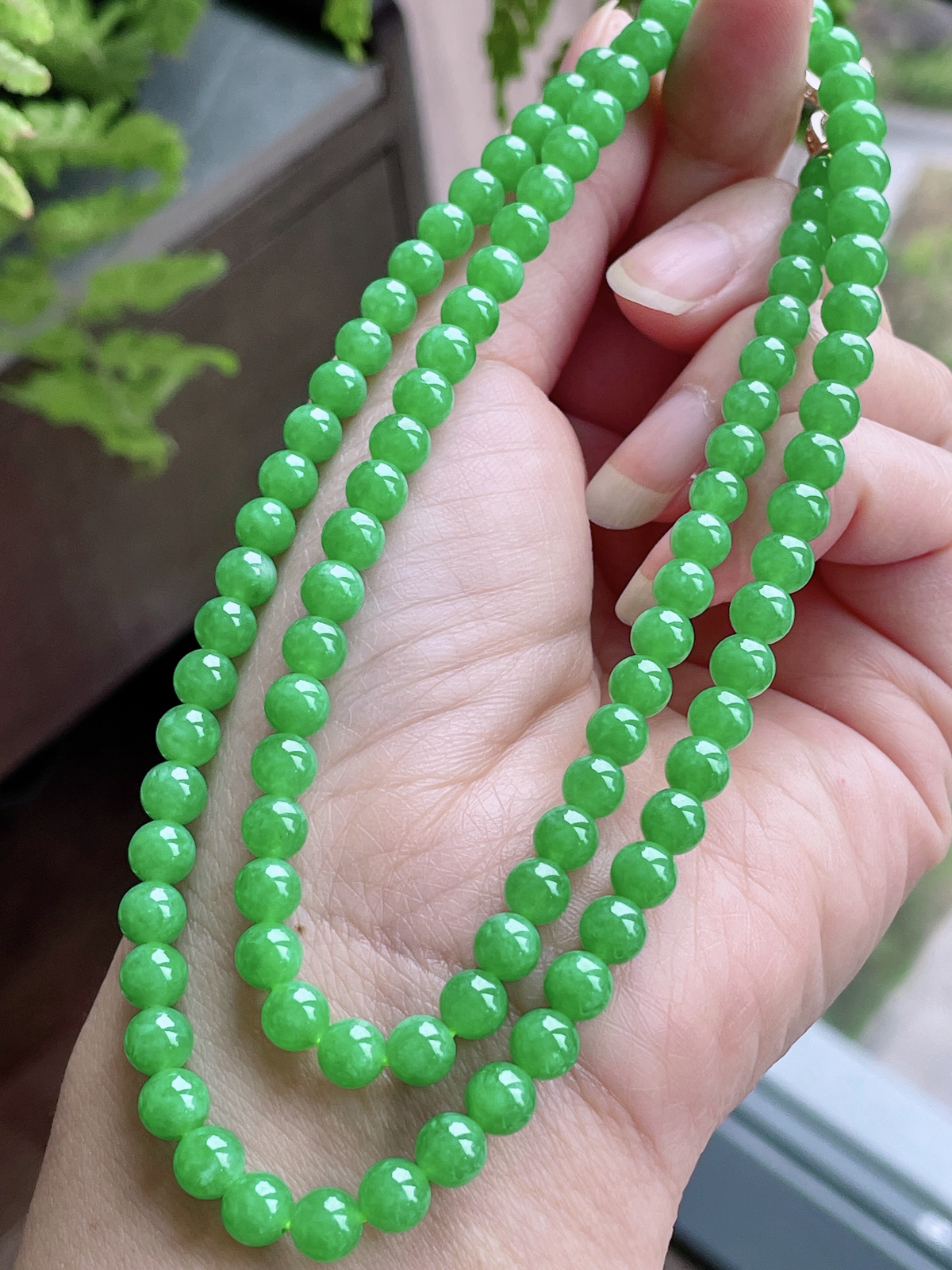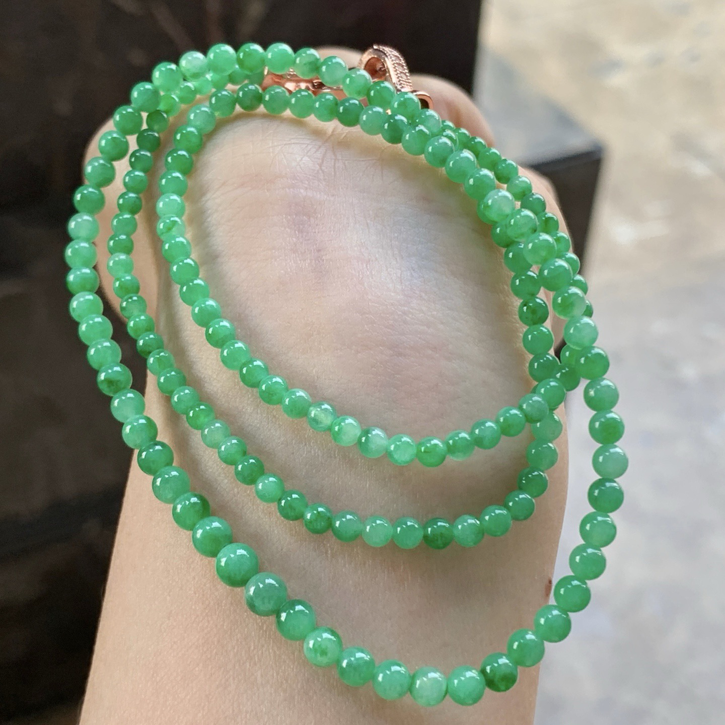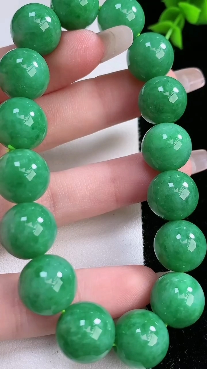 A货翡翠,冰润满绿圆珠手链,玉质细腻,色彩鲜艳,水头饱满,形体漂亮,水润精细,佩戴效果好