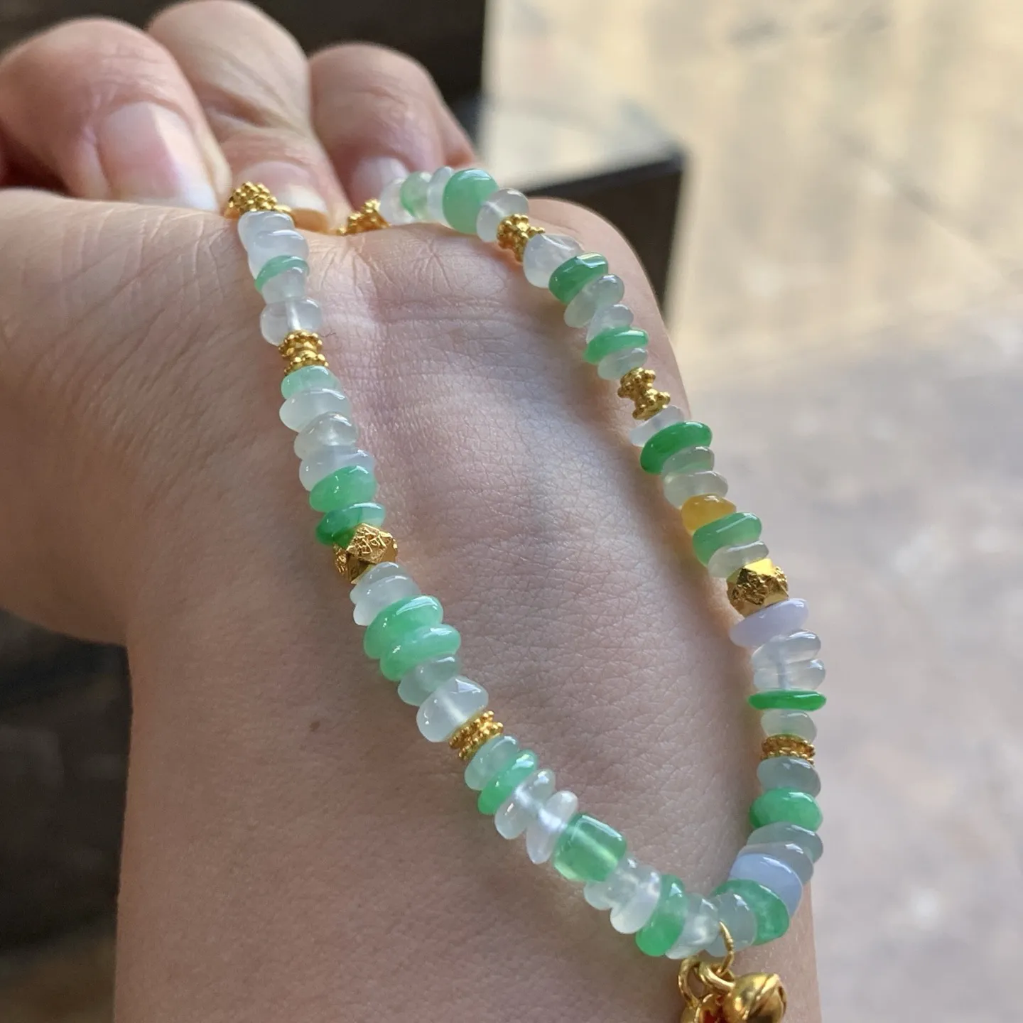 阳绿无事牌手链,色泽均匀艳丽,玉质细腻,荧光感超 强,饱满圆润,尽显优雅气质,18k 金豪华镶嵌