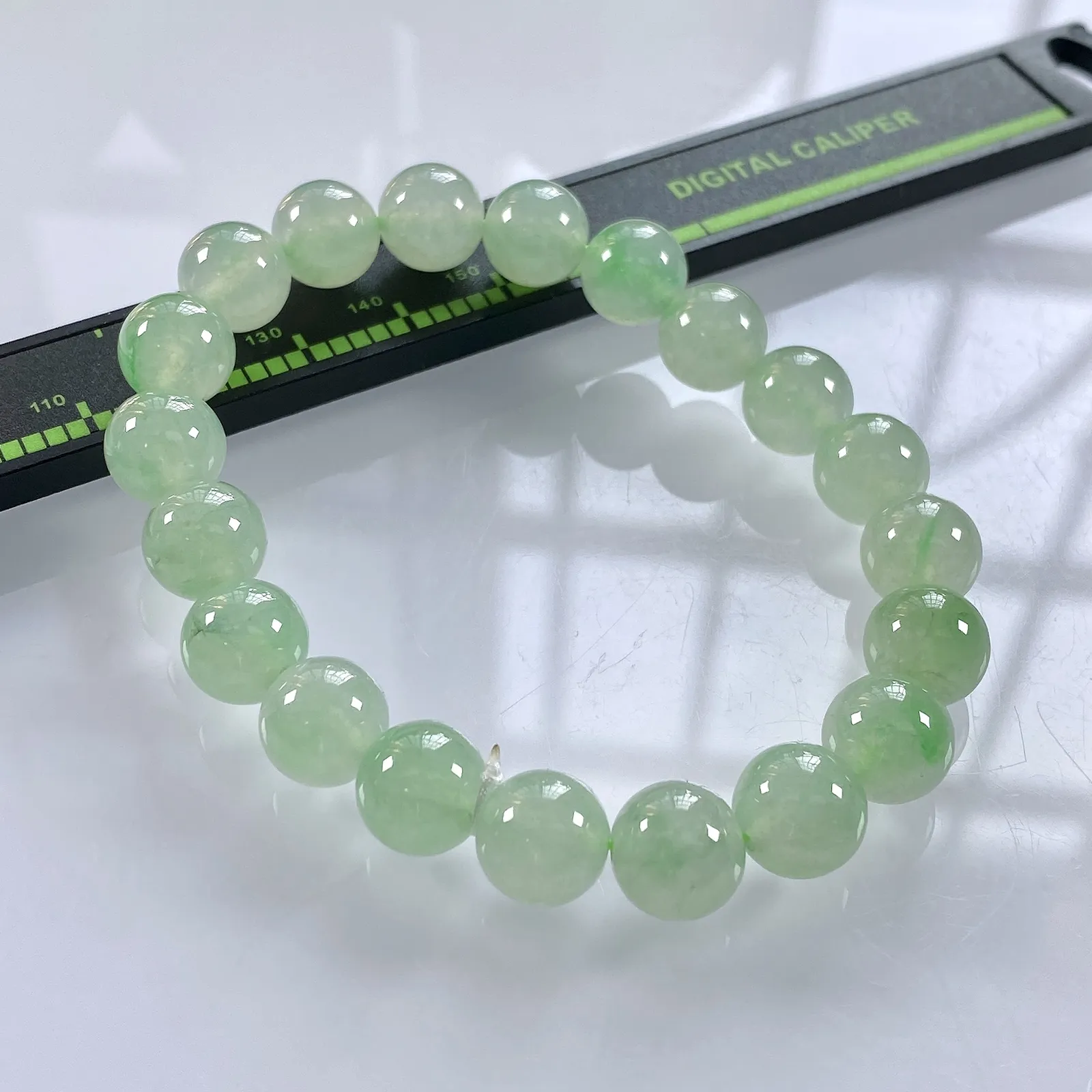 缅甸天然翡翠A货,卡9.8冰种起胶略飘绿圆珠手串手链,尺寸:9.8mm/20颗,长度195mm,重量