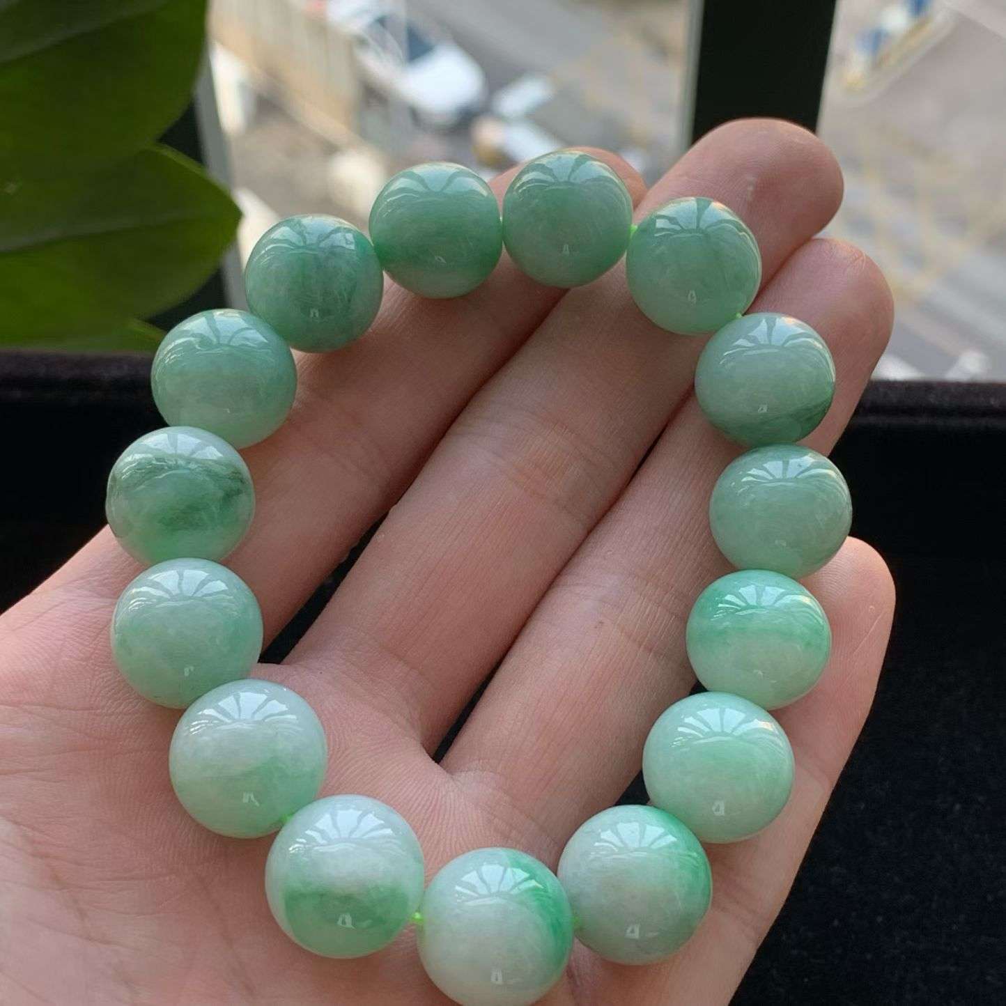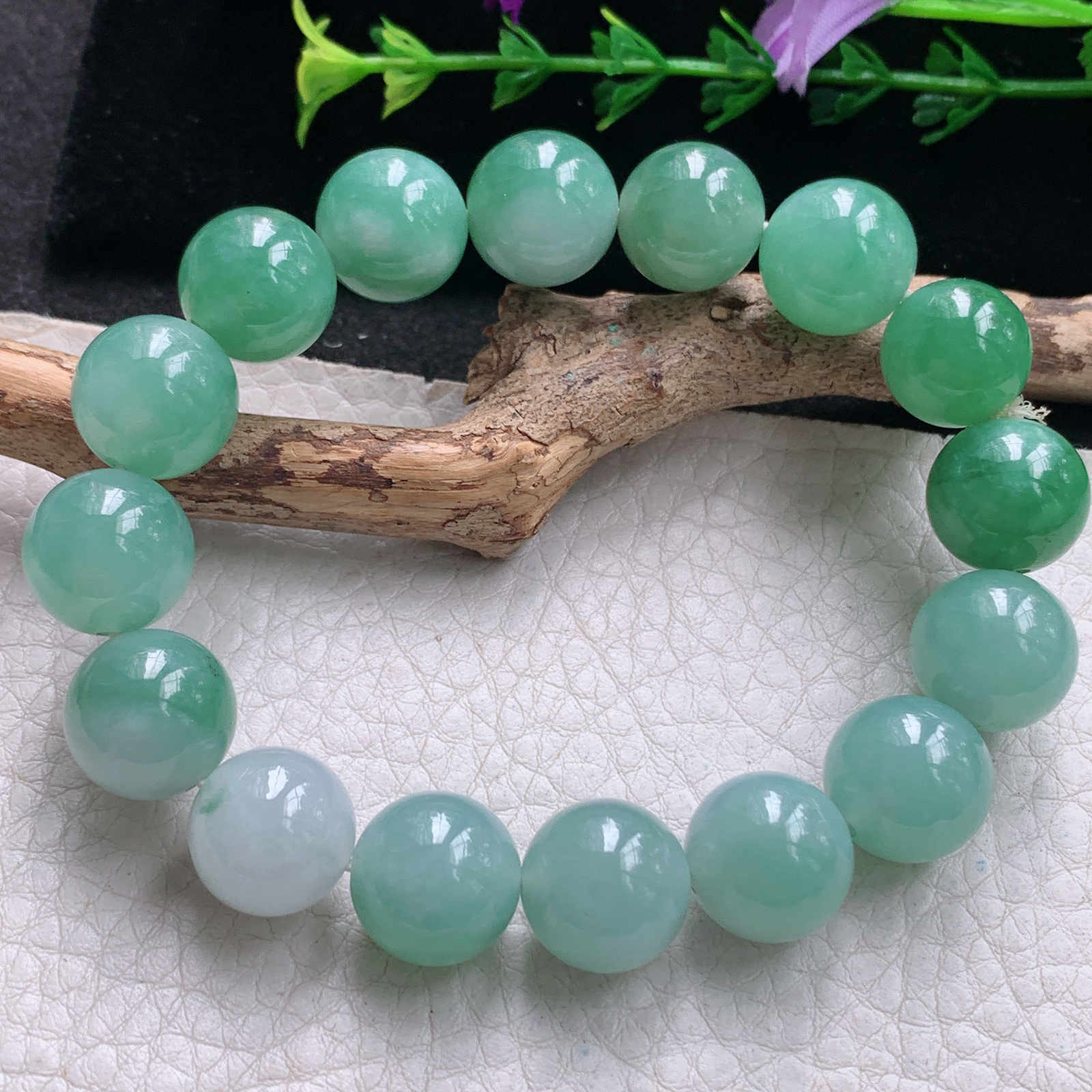lz实拍 缅甸翡翠精雕冰润满绿饱满13.2mn圆珠玉手链 玉手串