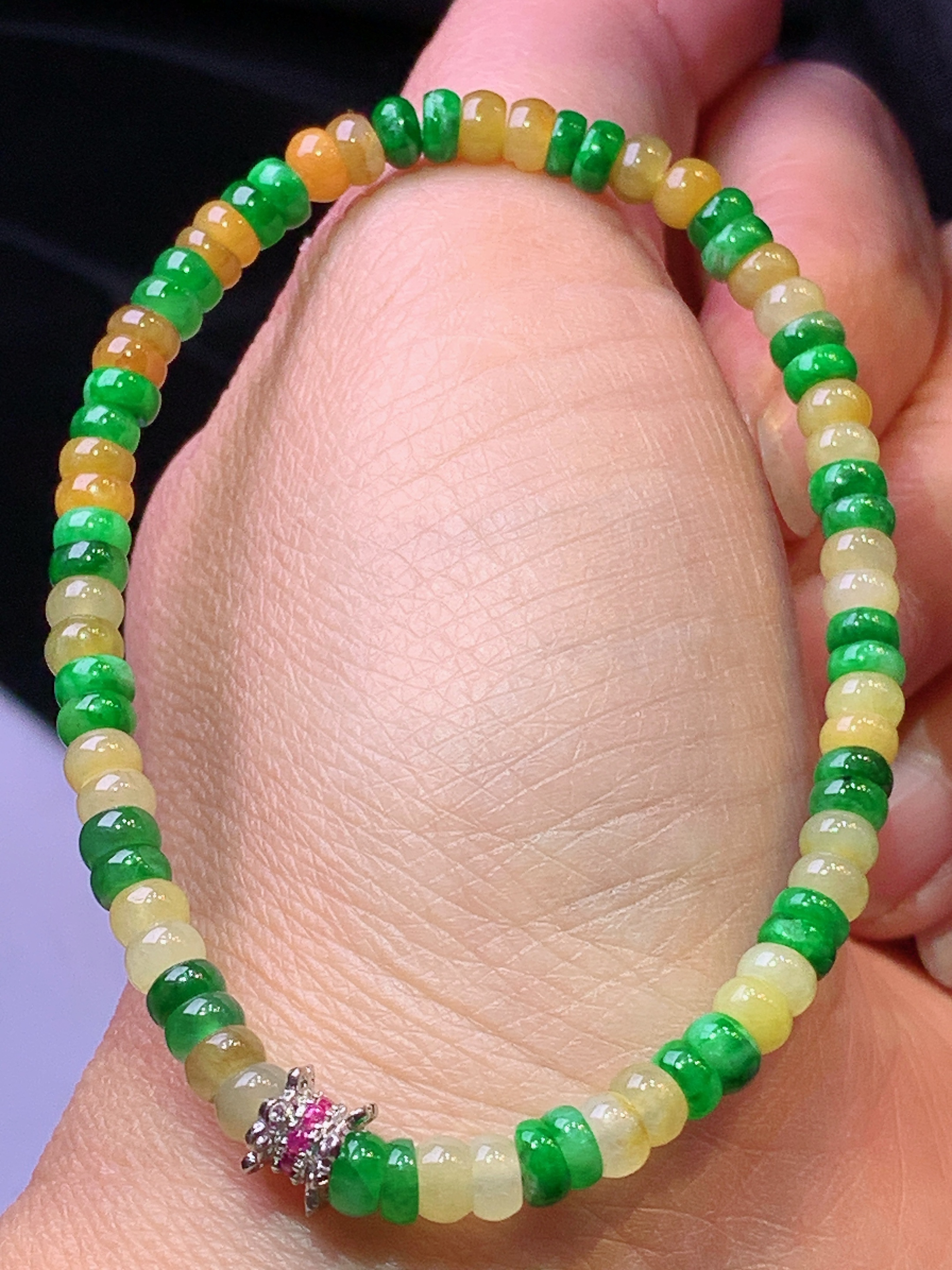 黄绿算盘珠手链 玉质细腻 色泽艳丽清新 水润亮眼 整体尺寸4.5*3w1