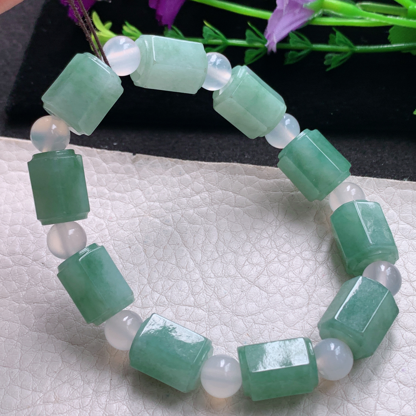 lz实拍14.5*10.8缅甸翡翠精雕冰飘花清爽满绿六六顺玉手链 玉手串