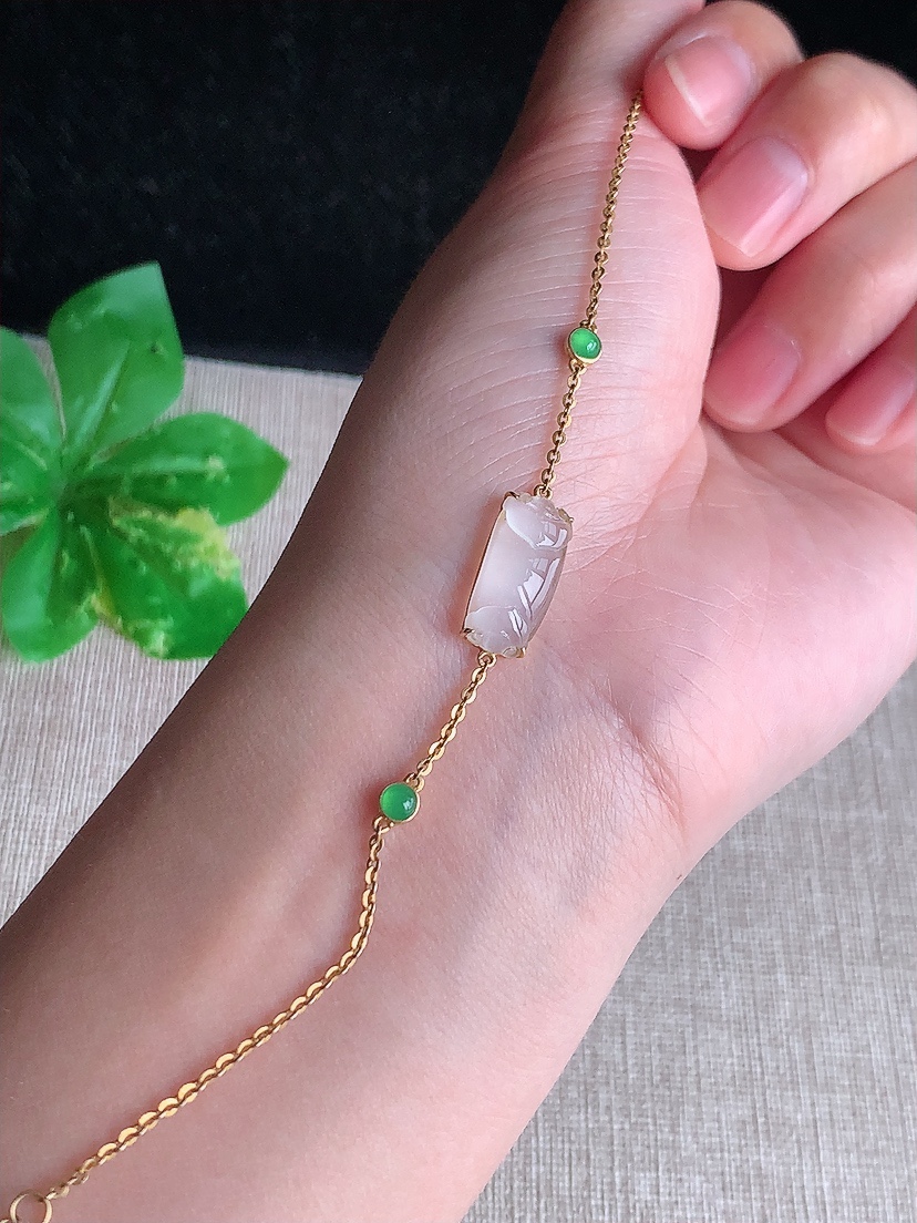 天然A货翡翠18K金镶嵌白冰白月光如意手链 尺寸15.8-7.2-3.5mm 重量2.05g 04