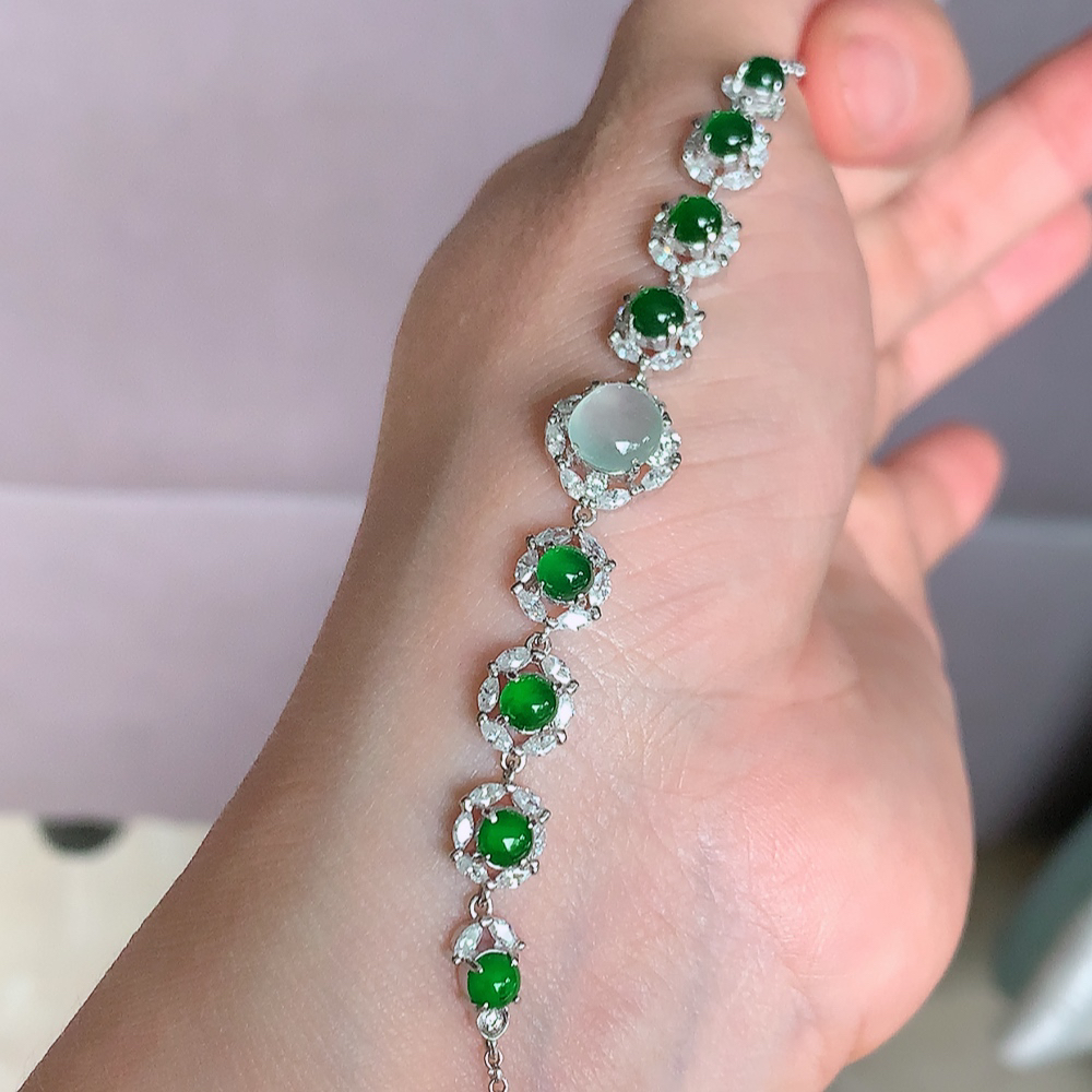 冰润满绿翡翠蛋面手链,水水润润,珠圆玉润,颜色鲜艳,妙明清净,清秀高雅,佩戴效果优雅迷人!性价比超值