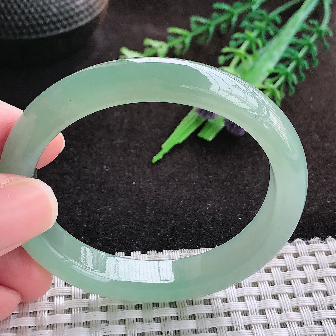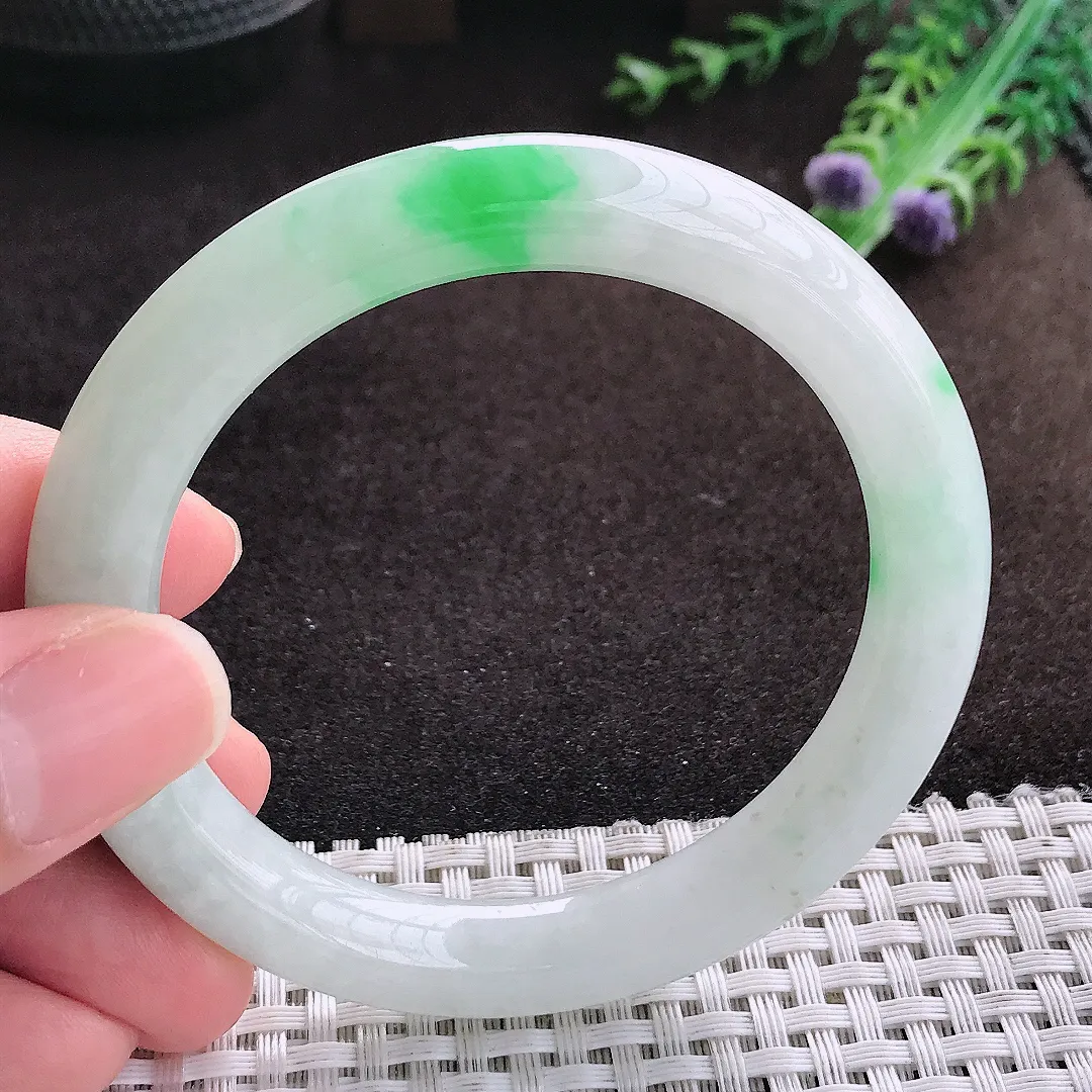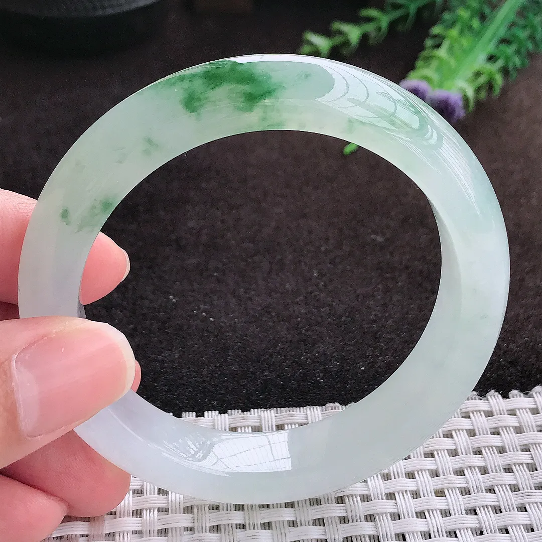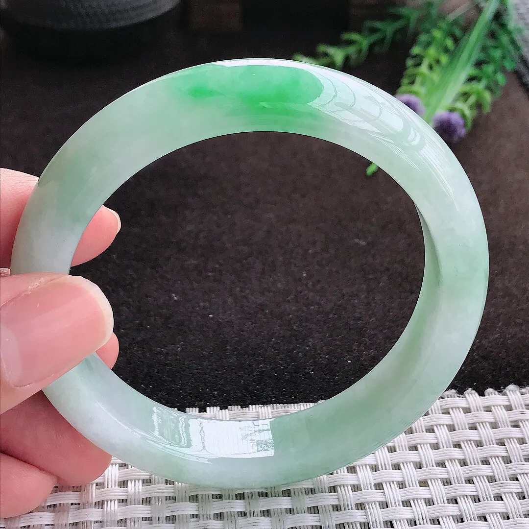 自然光55.5/12.5/9老坑冰胶果冻冰飘绿花手镯宽边翡翠玉镯手环
