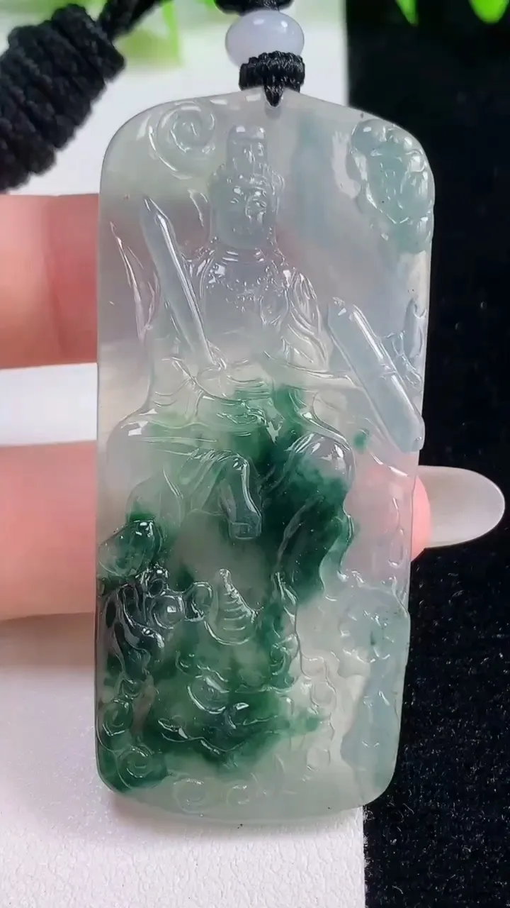 天然A货翡翠种飘花文殊菩萨吊坠,尺寸63.3-28.9-5,重量:25.52g 10月21日