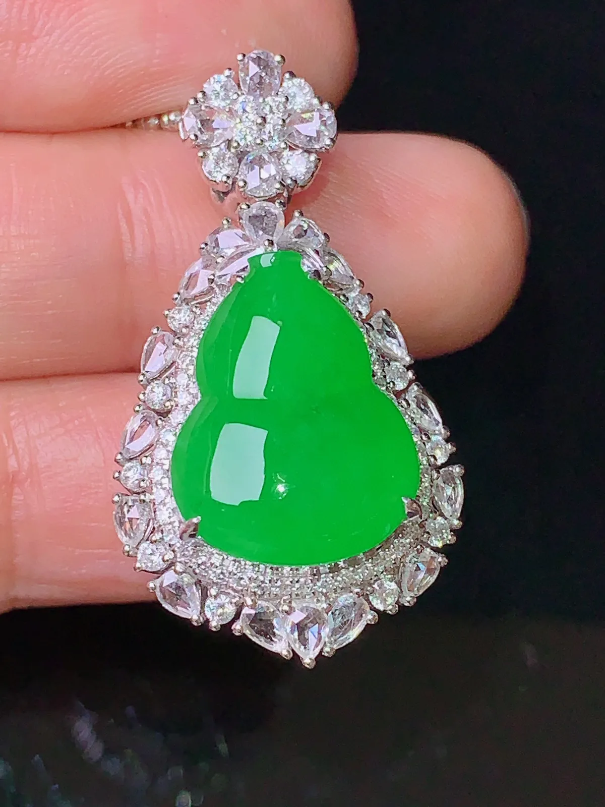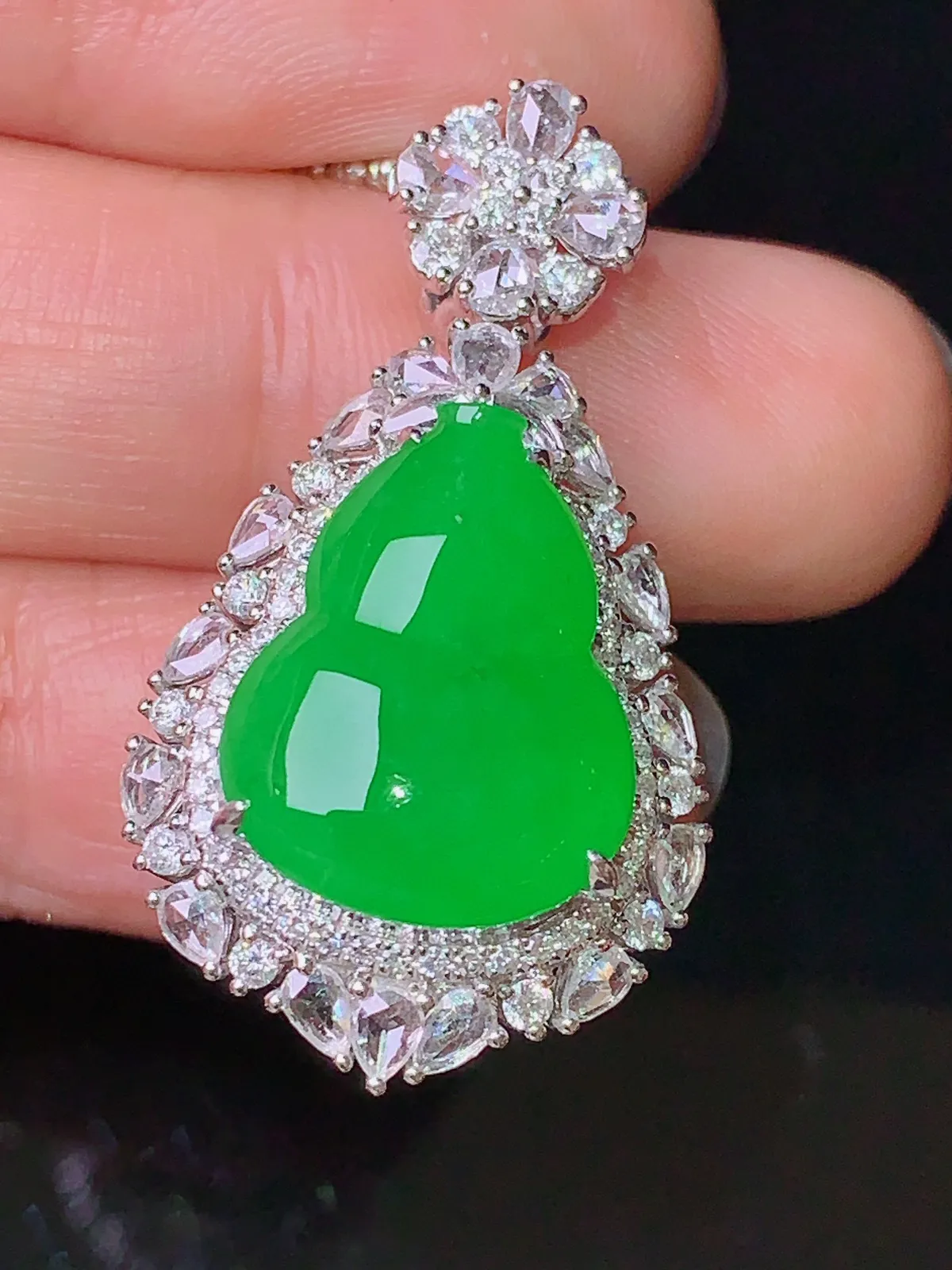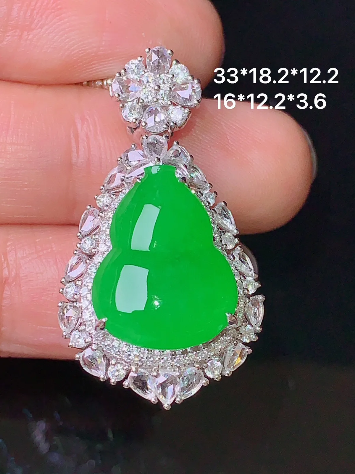 18k金钻镶嵌满绿葫芦吊坠 玉质细腻 色泽清新艳丽 整体尺寸33*18.2*12.2