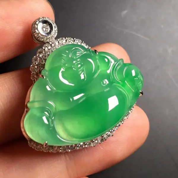 挂件的镶嵌是常见的翡翠镶嵌件种类,树叶、福豆、如意、佛公等,也有各种形状的戒面和随形小挂件,一般选用K金镶嵌,串在项链上当成吊坠佩戴。