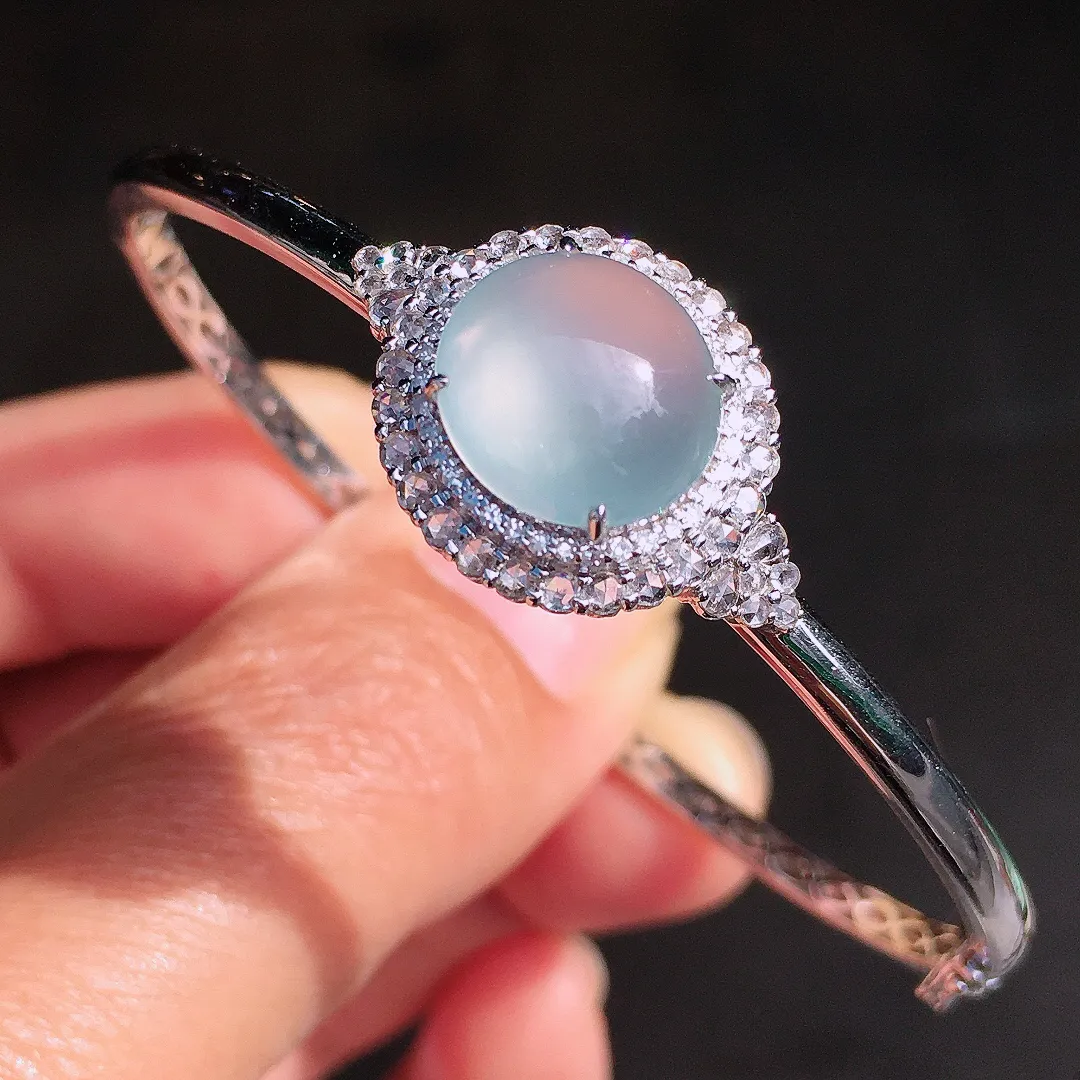 冰种蛋面手镯,玉质细腻,荧光感超 强,饱满圆润,尽显优雅气质,18k 金豪华镶嵌