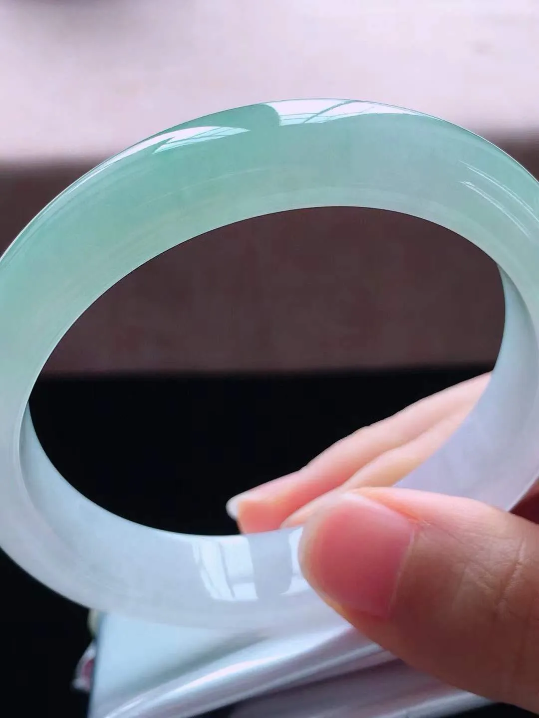 【翡翠名称】老种冰晴绿56.5贵妃圈口翡翠手镯 【翡翠尺寸】56.5*50*12.3*7.5mm适合