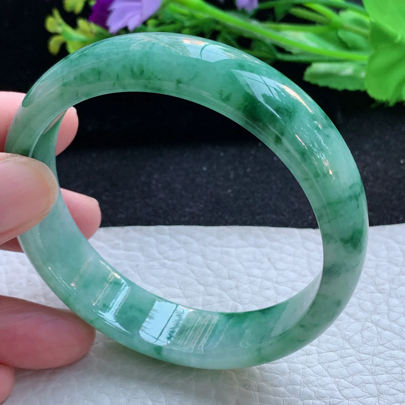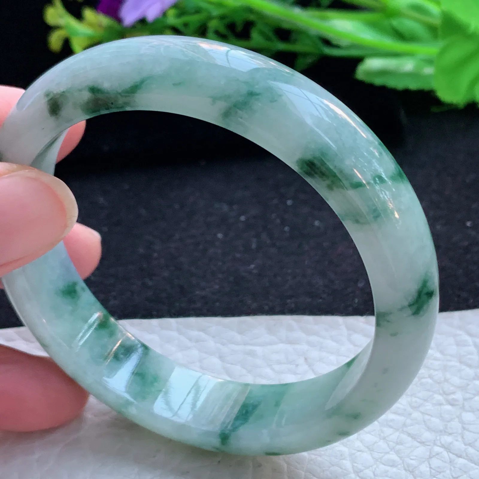 天然A货翡翠60/12.8/7.5老坑冰胶果冻飘花手镯宽边玉手镯