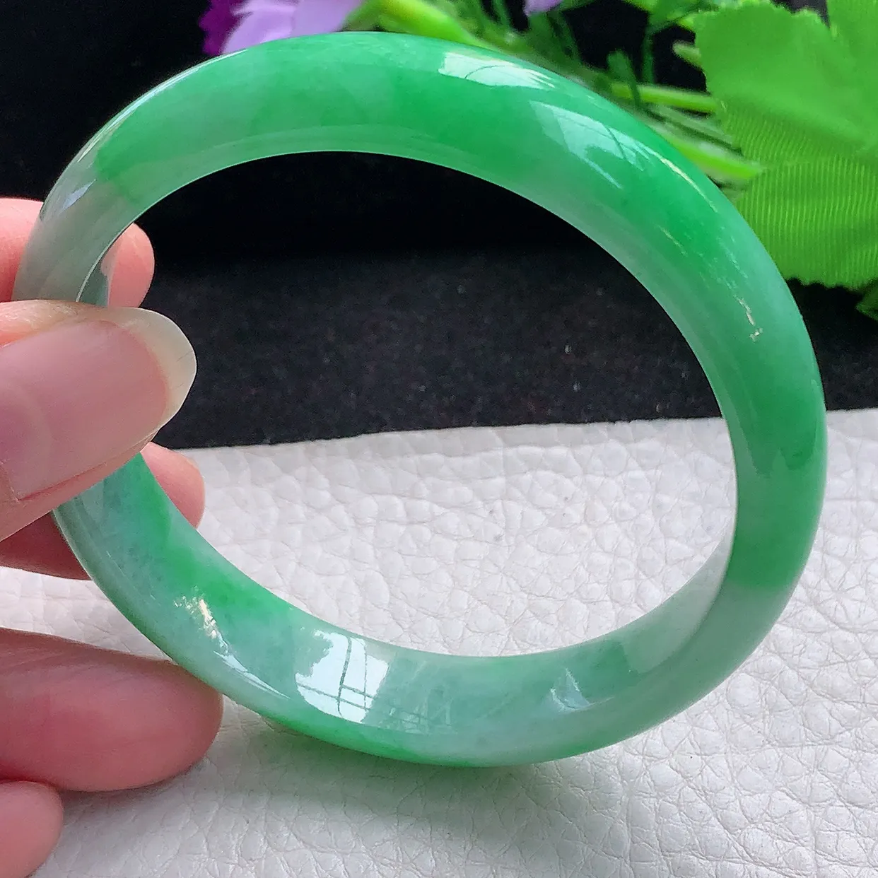 和田玉60圈口阳绿色碧玉手镯!玉质细腻油润 底色纯净 除了几个黑点外 无裂无杂 脂粉好,品质高