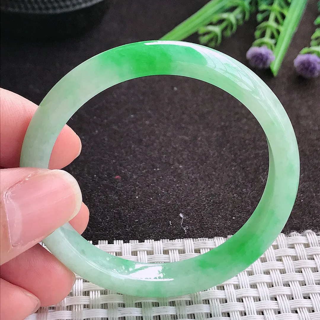 实拍A货翡翠51/9.4/6.4老坑精美飘阳绿手镯小圈口宽边玉镯手环
