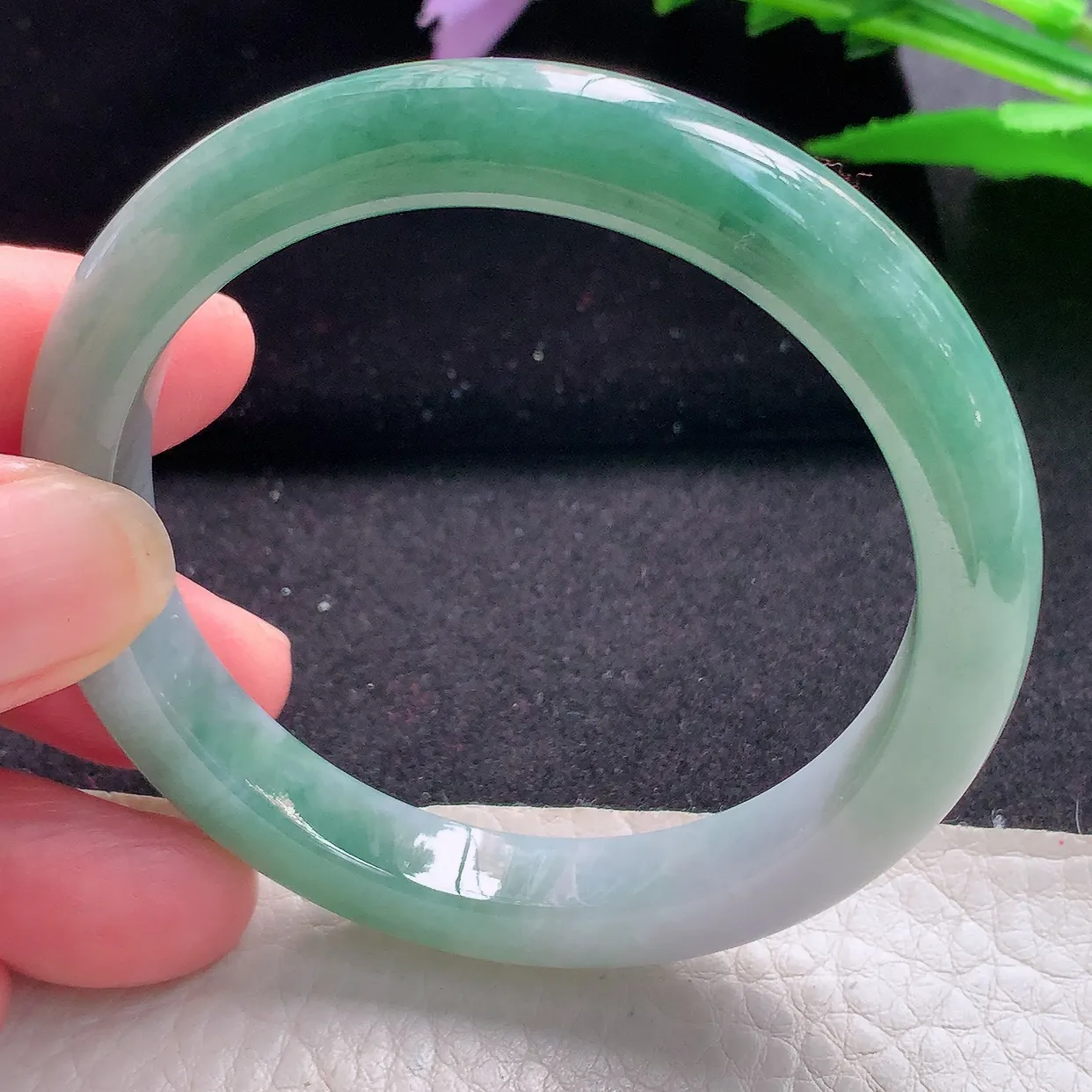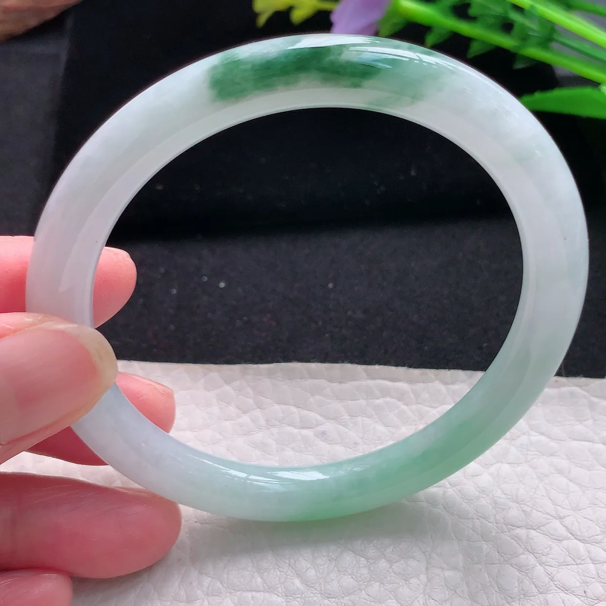 js自然光58.8*7.8*8.3美人镯 天然缅甸翡翠飘绿圆条珠宝玉手镯 玉手环