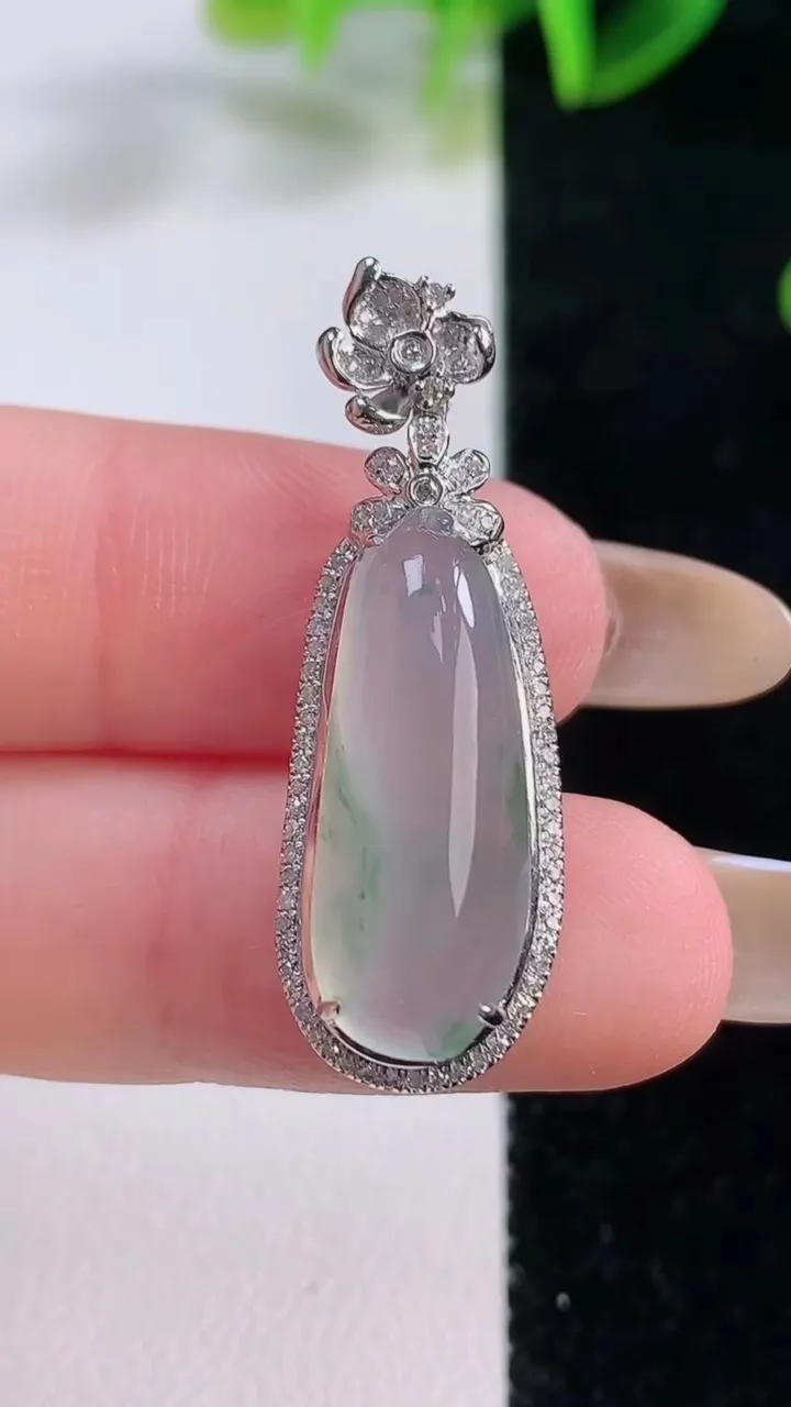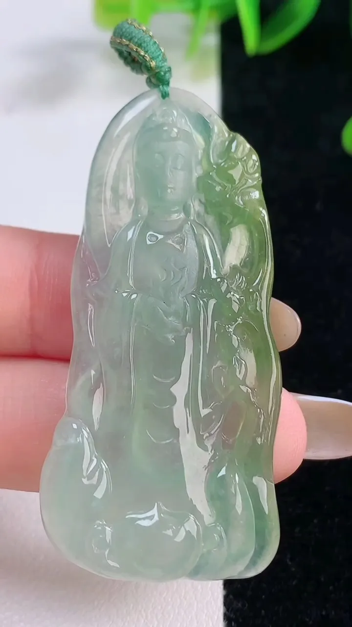 18k金钻镶嵌冰种观音菩萨吊坠 玉质细腻 色泽清新艳丽 整体尺寸64*50*5.8