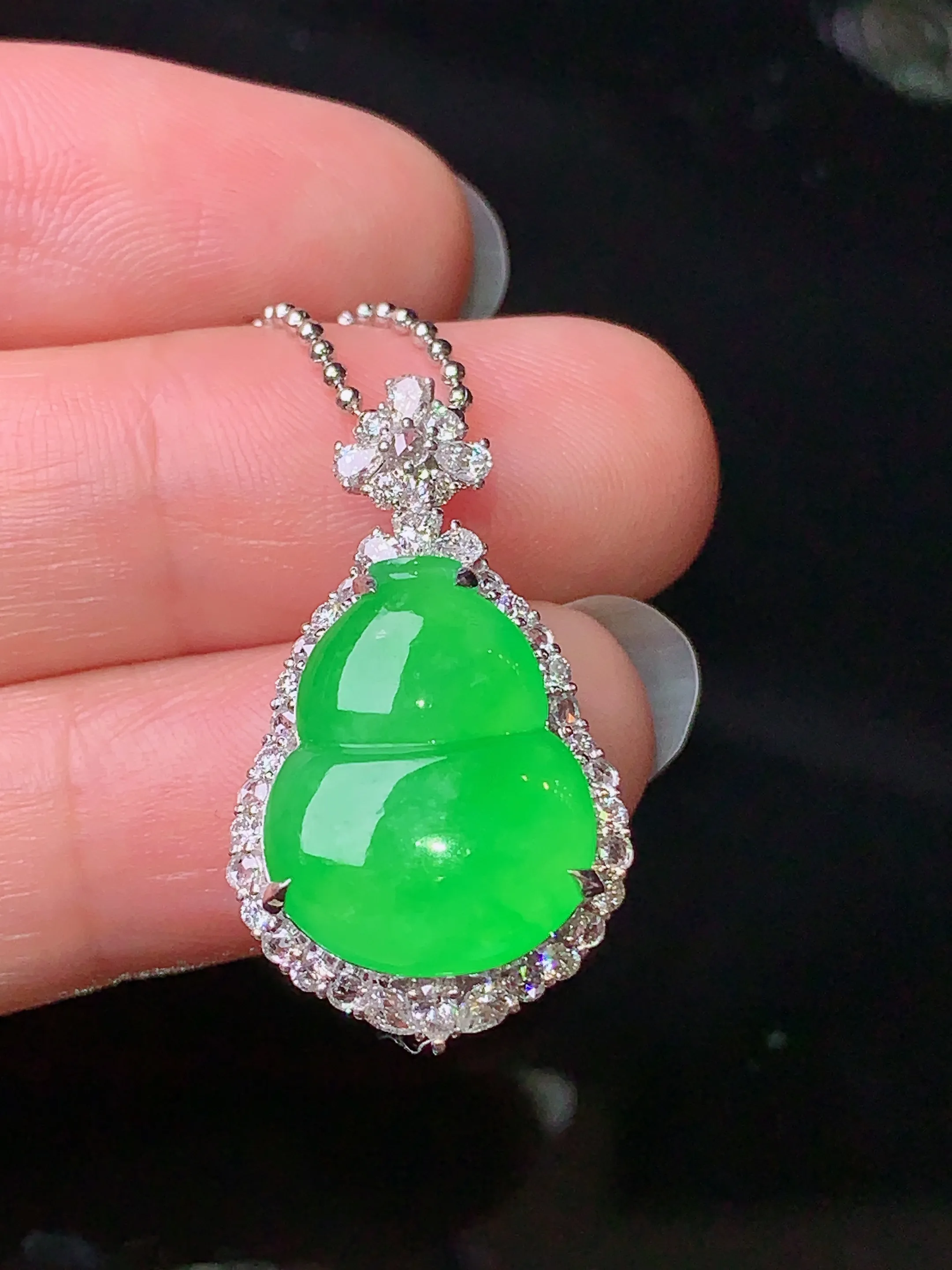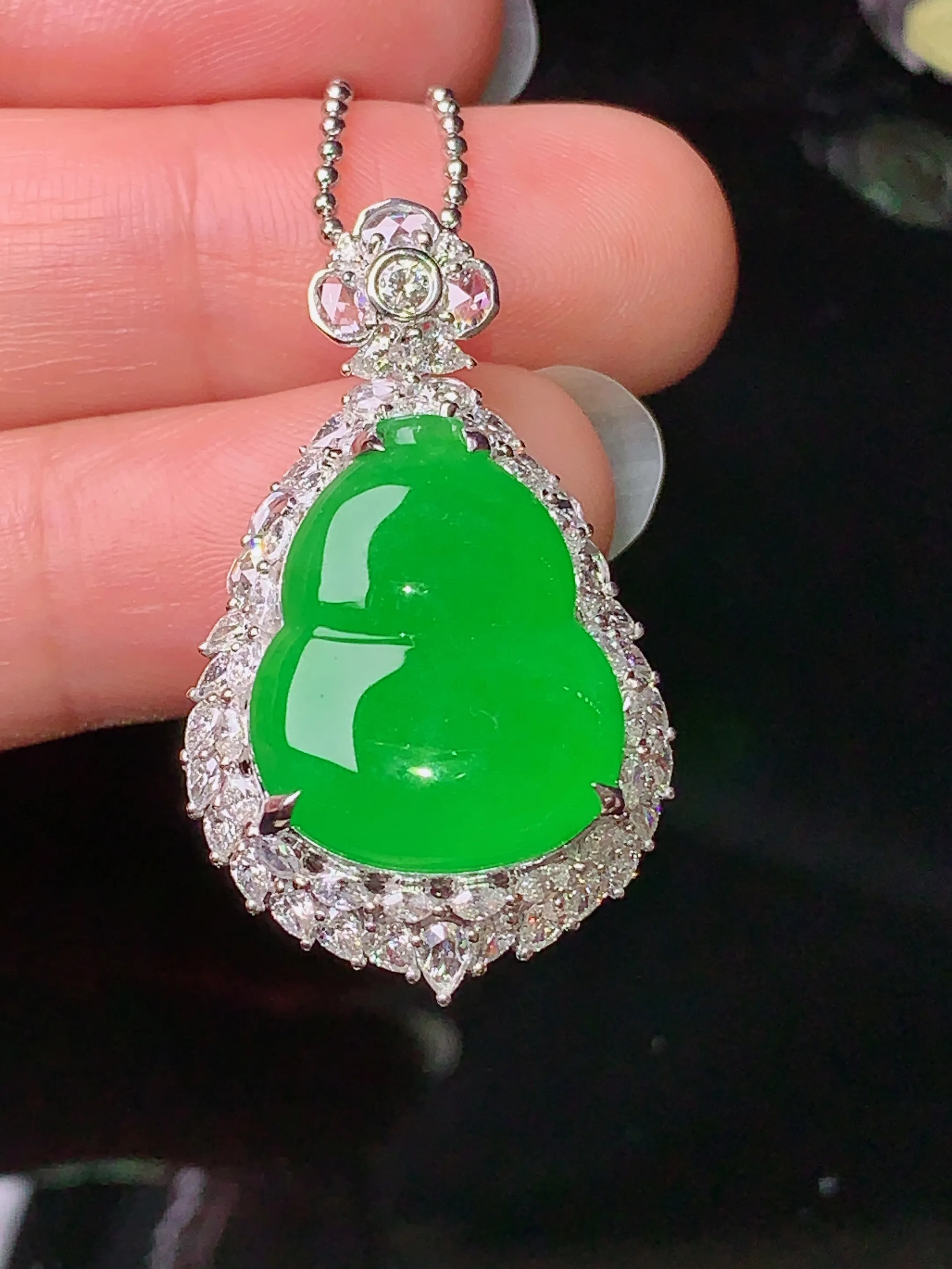 18k金钻镶嵌满绿葫芦吊坠 玉质细腻 色泽清新艳丽 整体尺寸27*15.5*9.8