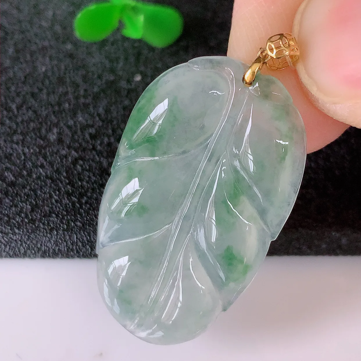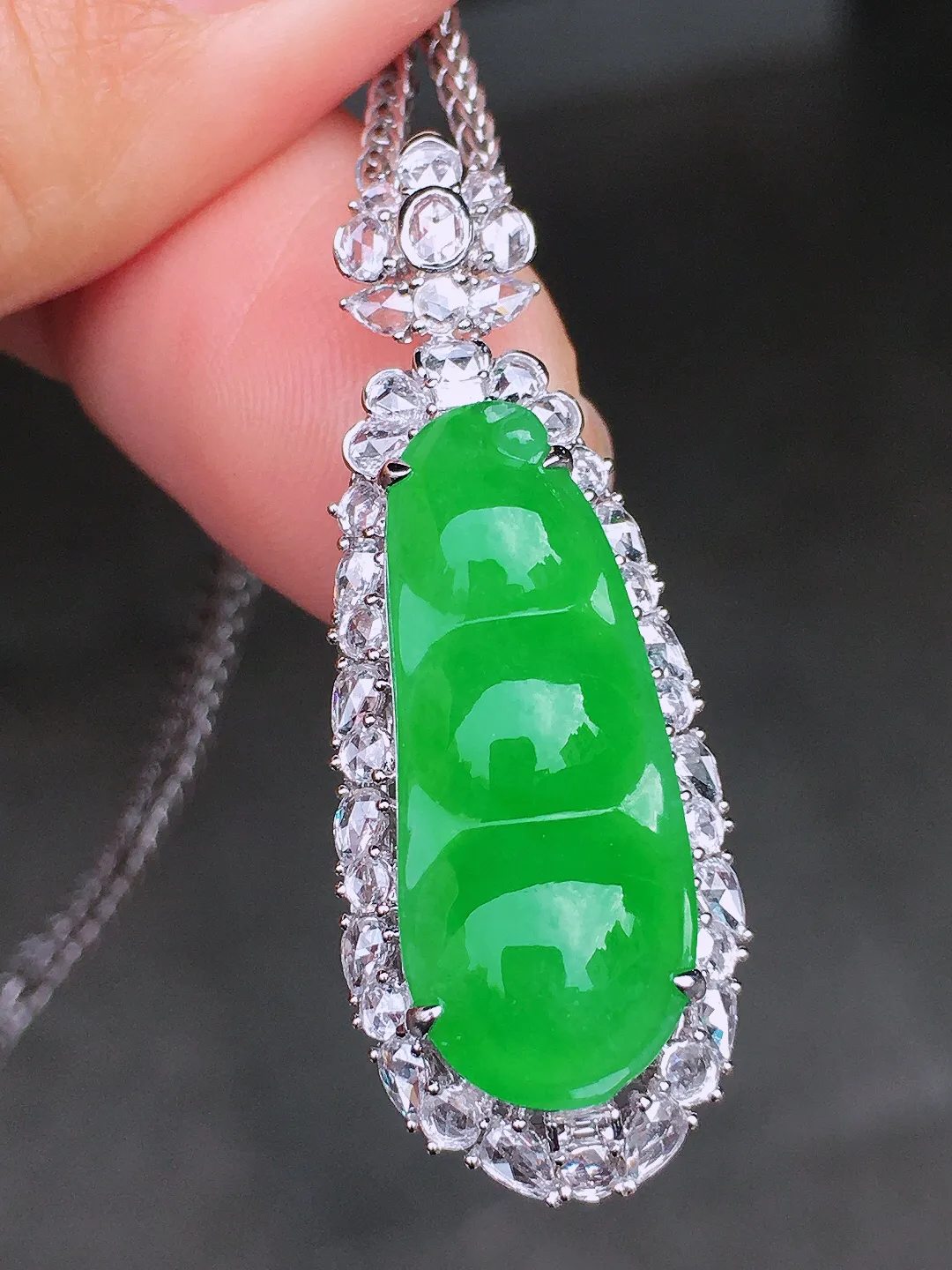 18k金钻镶嵌翠绿四季豆吊坠 玉质细腻 色泽清新艳丽 整体尺寸31*14*9.6