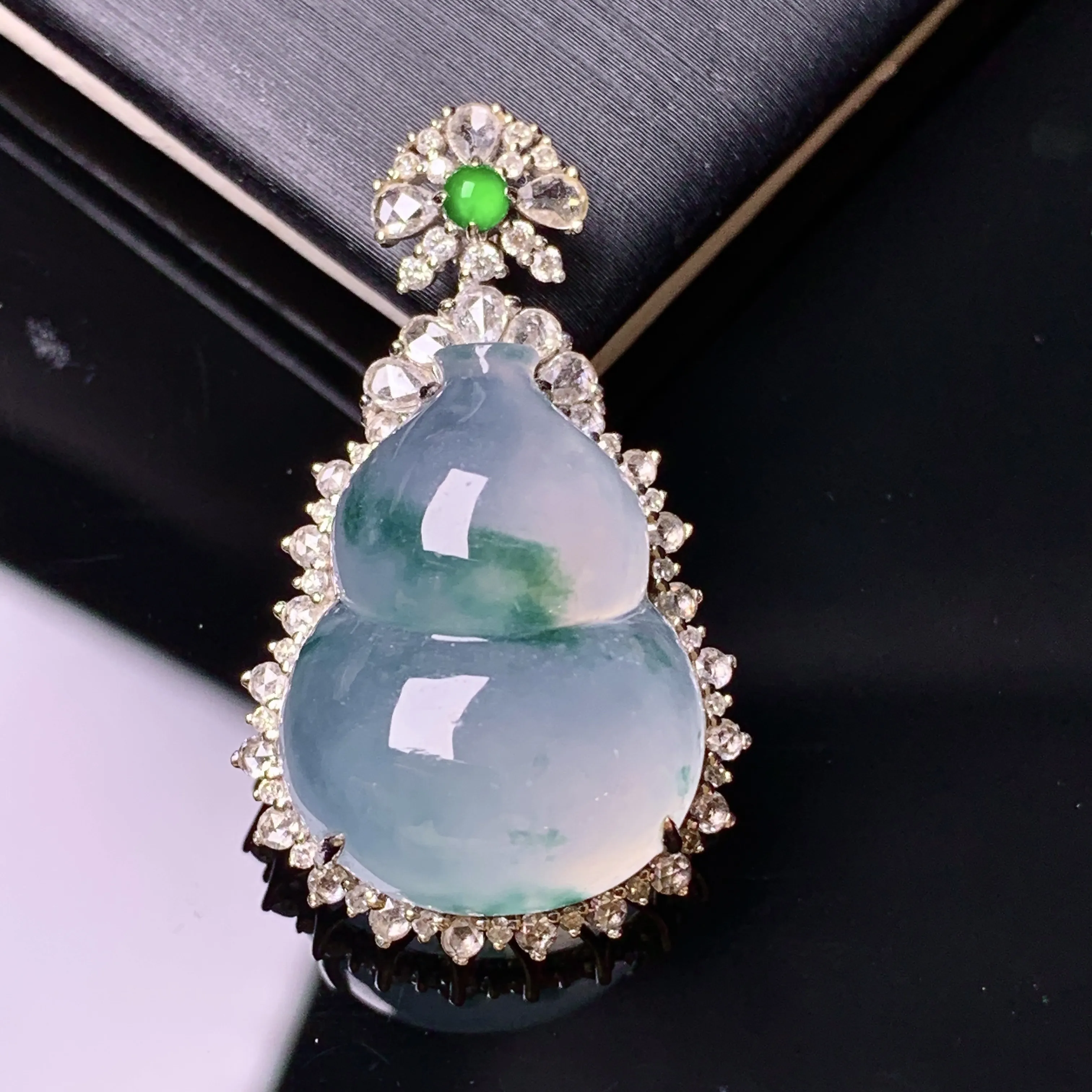 18k金钻镶嵌冰种飘绿葫芦吊坠 玉质细腻 色泽清新艳丽 整体尺寸31.7*18.7*10.7
