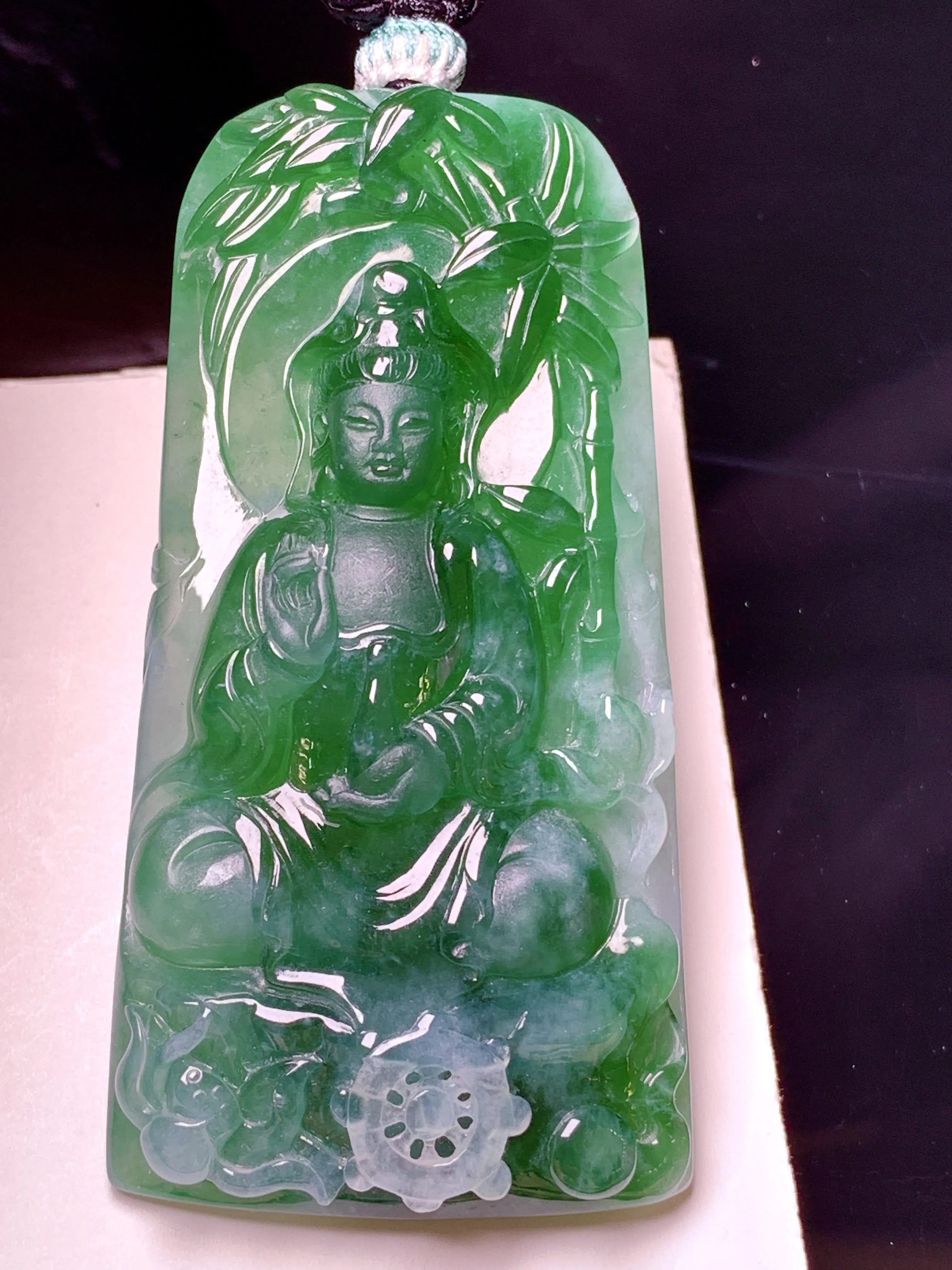 飘绿观音菩萨吊坠 玉质细腻 色泽艳丽清新 整体尺寸59.5*30.2*9.8