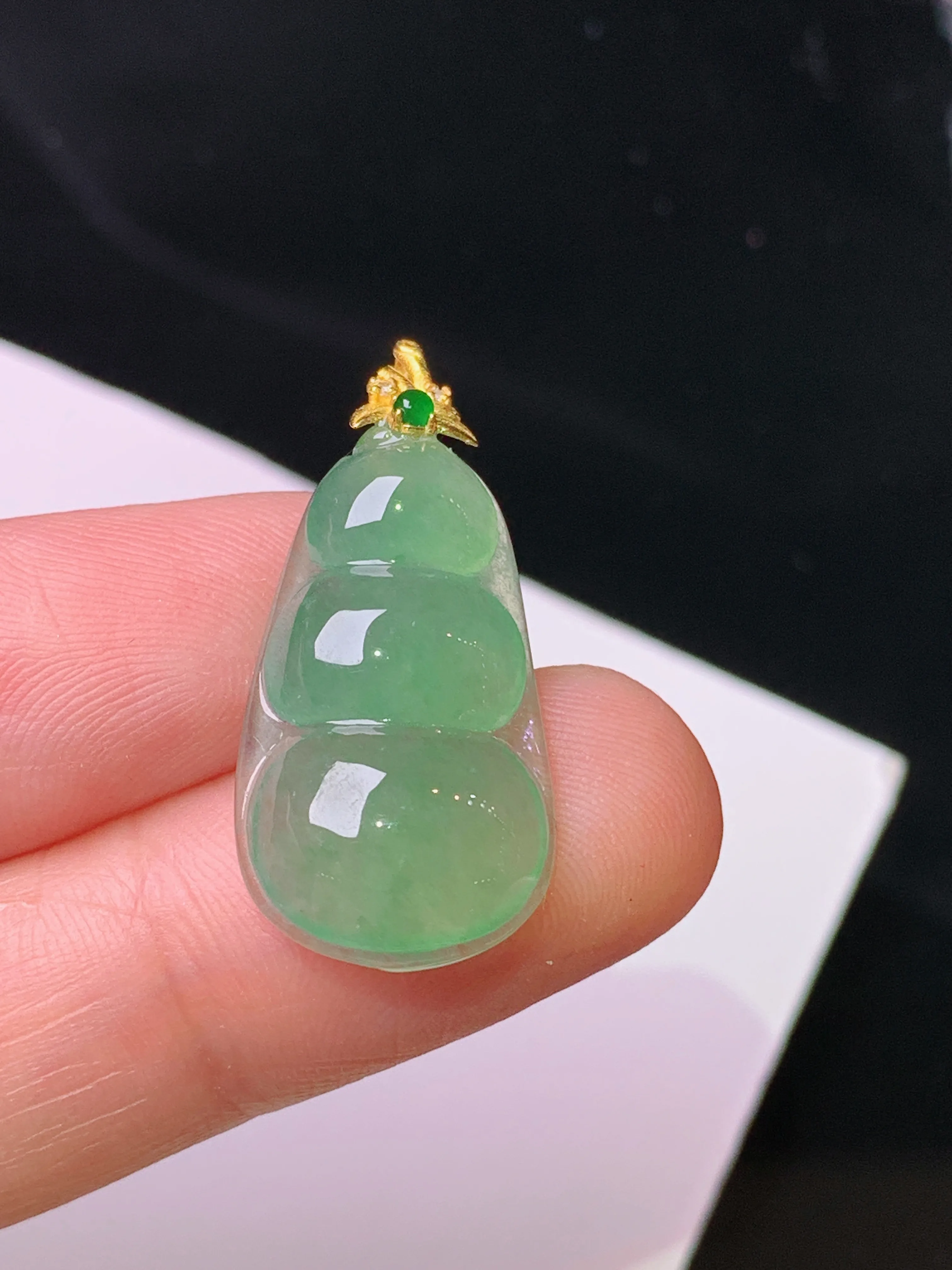 18k金镶嵌晴绿四季豆吊坠 玉质细腻 色泽艳丽清新 整体尺寸28.5*13*4.8