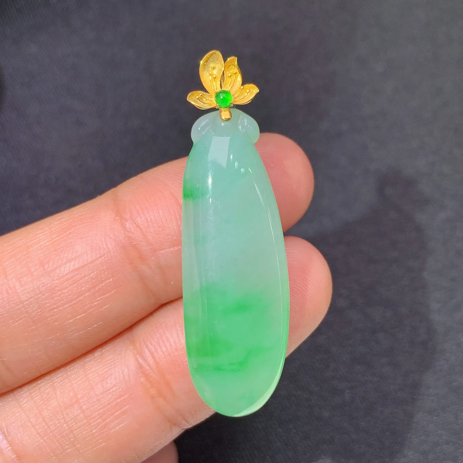 冰飘绿福瓜吊坠,18k金镶嵌,冰润色阳,玉质细腻,种水足 尺寸38.7*11.4*4.9