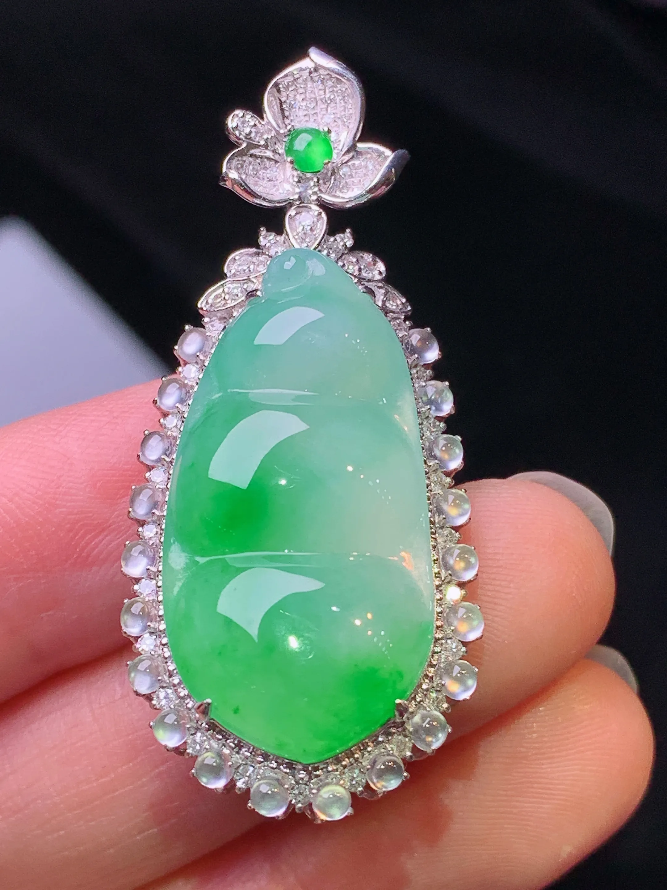 18k金钻镶嵌冰种四季豆吊坠 玉质细腻 色泽艳丽清新 整体尺寸23.7*11.6*9