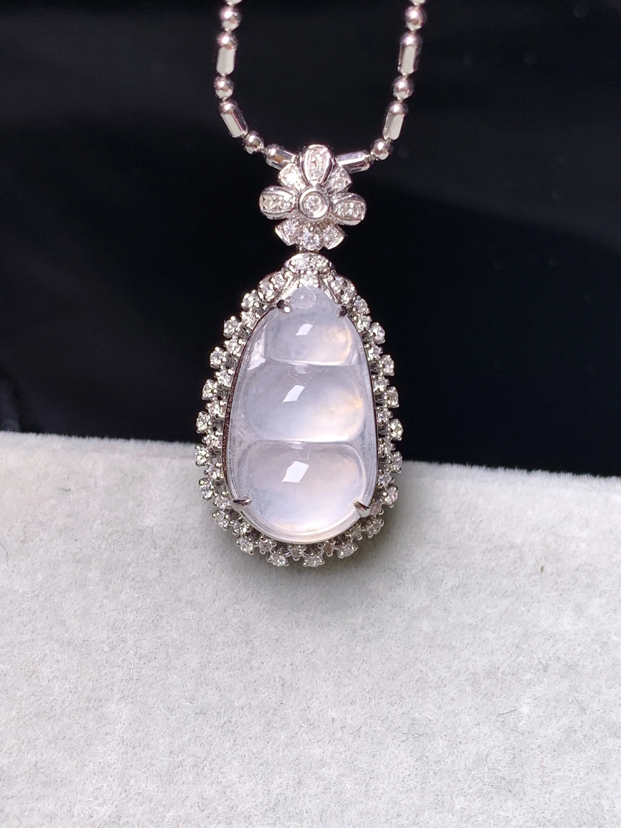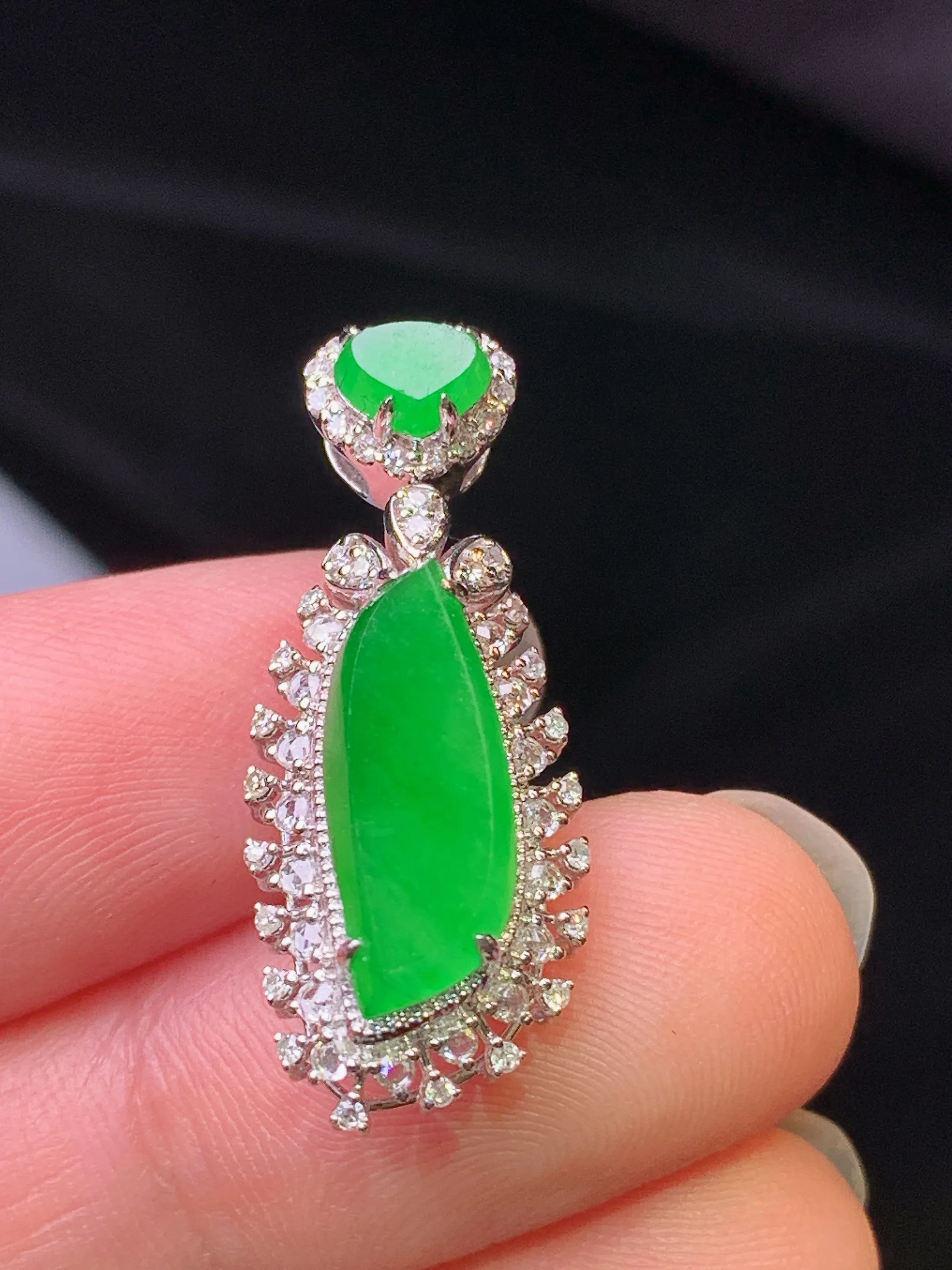 18k金钻镶嵌飘绿四季豆吊坠 玉质细腻 色泽艳丽清新 整体尺寸44.2*19.5*10.3