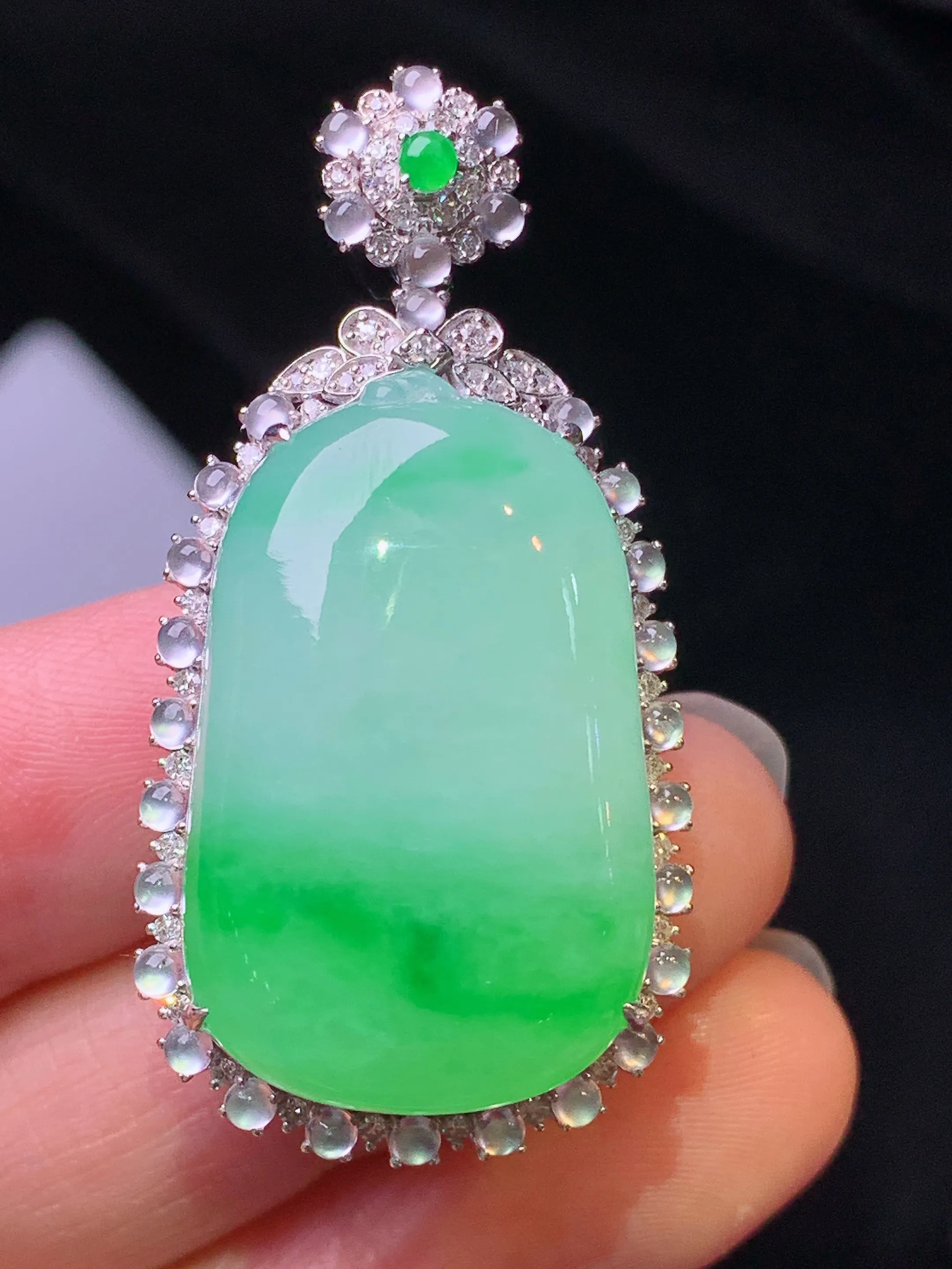 18k金钻镶嵌随形吊坠 玉质细腻 色泽艳丽清新 整体尺寸27.8*11.2*8.2